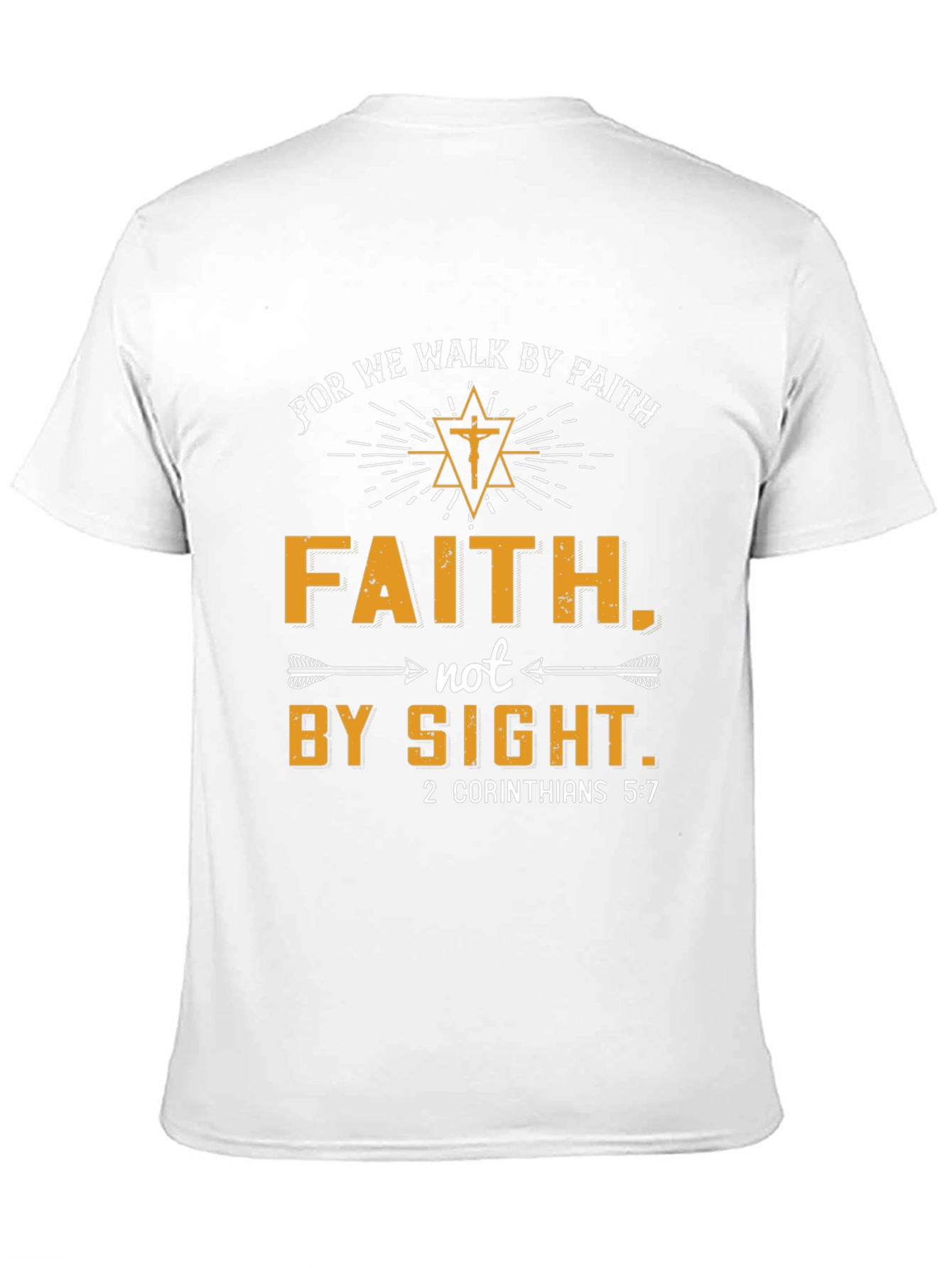 Show your faith with this stylish black t-shirt! This tee features the powerful message 'For we walk by faith, not by sight. 2 Corinthians 5:7' boldly printed in a vibrant yellow. The design incorporates a cross within radiating lines, adding a unique touch. Made from a comfortable-looking fabric, this shirt is perfect for everyday wear, church events, or as a thoughtful gift for loved ones. Let your faith shine with this eye-catching t-shirt!