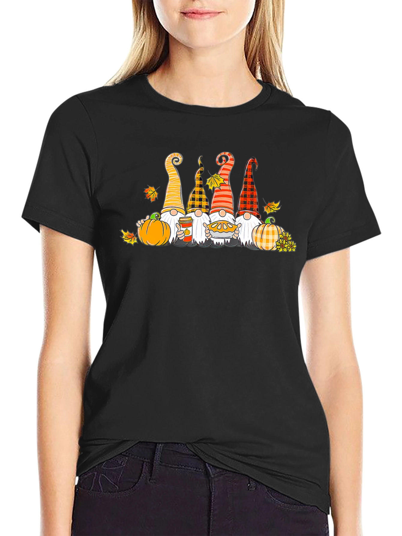 Celebrate fall with this charming black T-shirt featuring adorable gnomes! The design showcases five festive gnomes donning autumn-themed hats, surrounded by pumpkins and colorful fall leaves. One gnome holds a coffee cup, while another carries a delicious pie, adding a touch of whimsy. Made from soft, comfortable fabric, this shirt is perfect for casual wear during the harvest season or Thanksgiving gatherings. The eye-catching design and relaxed fit make it a great addition to any wardrobe. Show your love for fall with this delightful gnome-themed T-shirt!