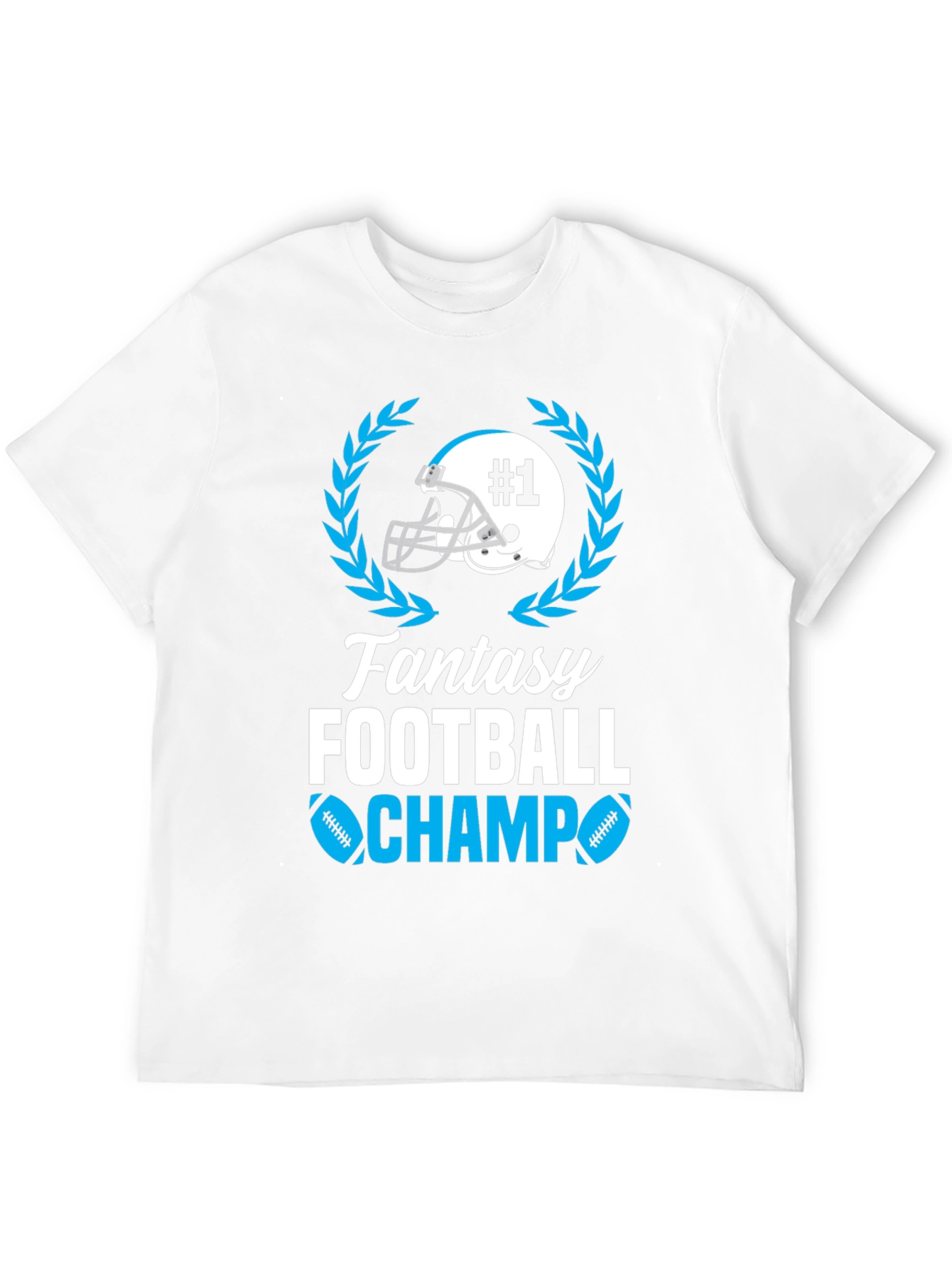 Declare yourself the ultimate Fantasy Football champion with this eye-catching t-shirt! This black tee features a bold design with the words "Fantasy Football CHAMP" prominently displayed in white and blue. A football helmet graphic with the number one is surrounded by a laurel wreath, completing the winning look. Made from a comfortable, breathable fabric, this shirt is perfect for game day, draft parties, or any casual occasion where you want to show off your fantasy prowess. Let everyone know who reigns supreme in your league with this champion-worthy t-shirt!