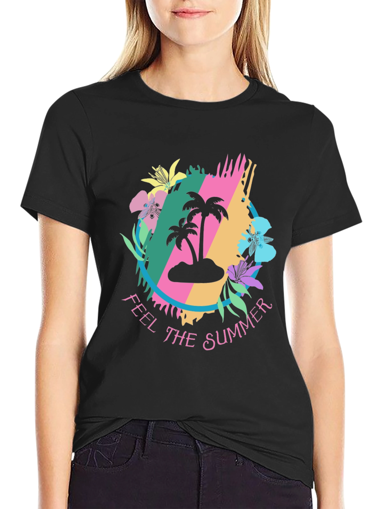 Embrace the vibes with this eye-catching "Feel The Summer" graphic t-shirt. Featuring a vibrant, retro-inspired design with palm trees, flowers, and colorful stripes, this shirt is perfect for adding a touch of summer to your wardrobe. The design has the text "Feel The Summer". Crafted from a soft, breathable fabric, it ensures all-day comfort. Ideal for casual outings, beach trips, or simply lounging around, this tee is a must-have for those who love to spread the summer spirit wherever they go. Stand out from the crowd and let your style shine with this statement piece!