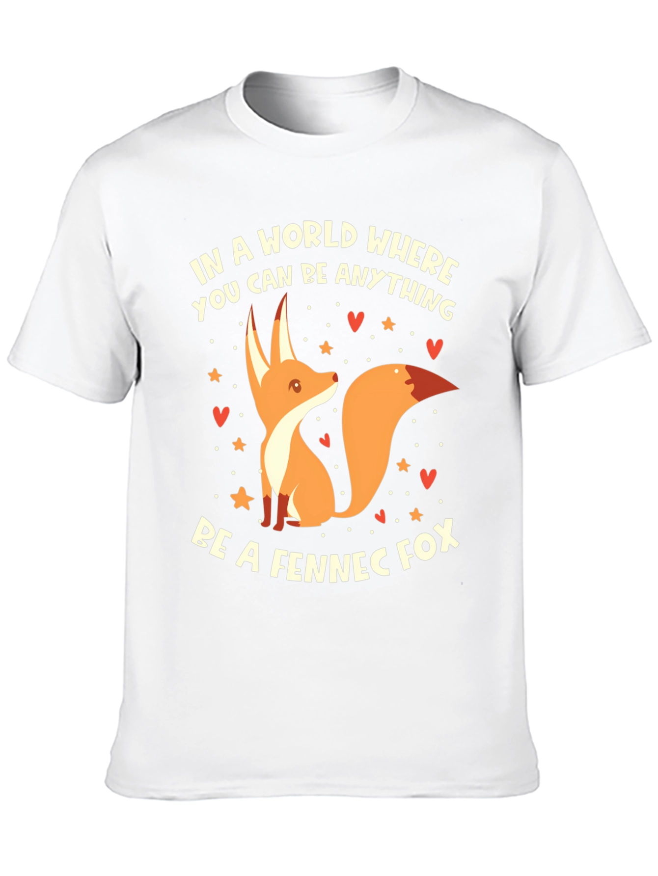 Showcase your love for foxes with this unique black graphic tee! Featuring a charming illustration of a fennec fox surrounded by stars and hearts. The playful design includes the quote "In a world where you can be anything, be a fennec fox", making it a fun and inspiring piece. Made from a comfortable fabric blend, this tee is perfect for everyday wear. Ideal for animal lovers, casual outings, or as a quirky gift. Express yourself and make a statement with this eye-catching t-shirt!