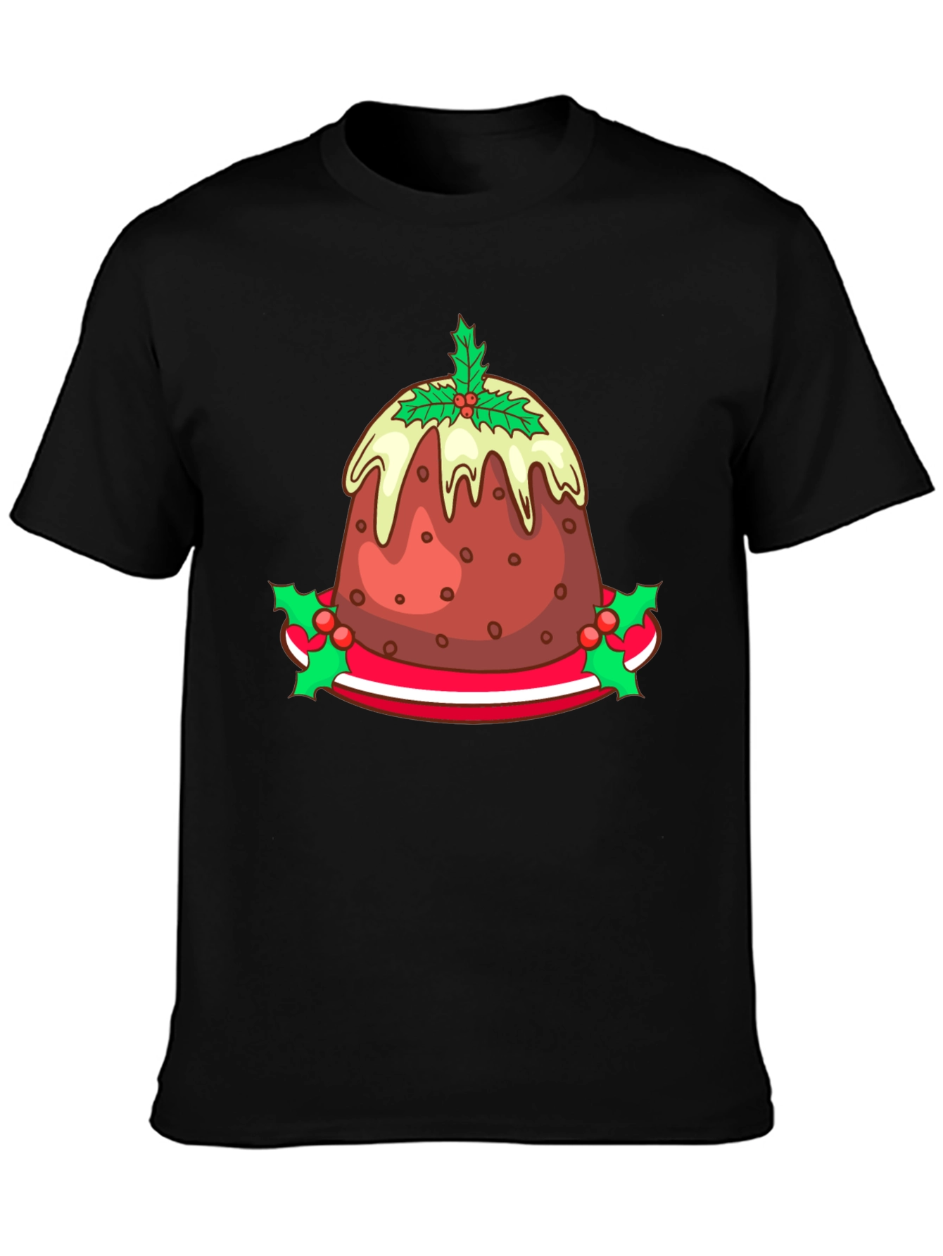 Get into the holiday spirit with this eye-catching black graphic tee! This shirt features a vibrant and detailed cartoon-style illustration of a classic Christmas pudding. Adorned with a creamy topping, holly leaves, and red berries, the design exudes festive cheer. Made from what appears to be a soft and comfortable fabric, this tee is perfect for casual holiday gatherings, festive parties, or simply spreading joy wherever you go. Show off your love for the holidays with this unique and stylish Christmas pudding tee. It's sure to be a conversation starter and a fun addition to your wardrobe!