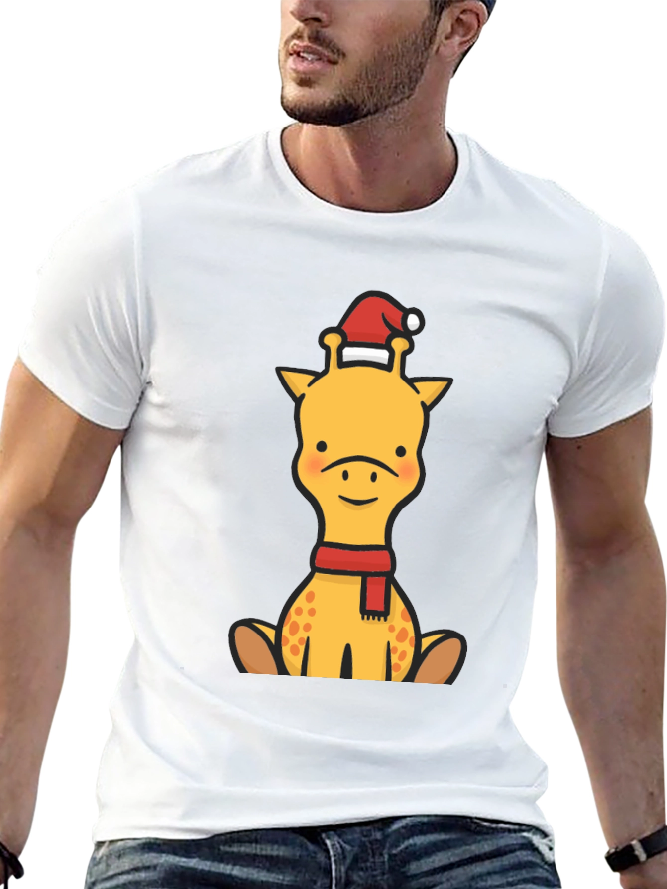 Spread some holiday joy with this adorable graphic tee! Featuring a charming cartoon giraffe sporting a Santa hat and festive red scarf, this shirt is perfect for adding a touch of whimsy to your wardrobe. The design is printed on a classic black tee, making it versatile and easy to pair with any outfit. Crafted from a soft, comfortable fabric, this shirt is ideal for casual wear during the holiday season or any time you want to showcase your playful side. Grab this fun and stylish tee and let the holiday spirit shine!