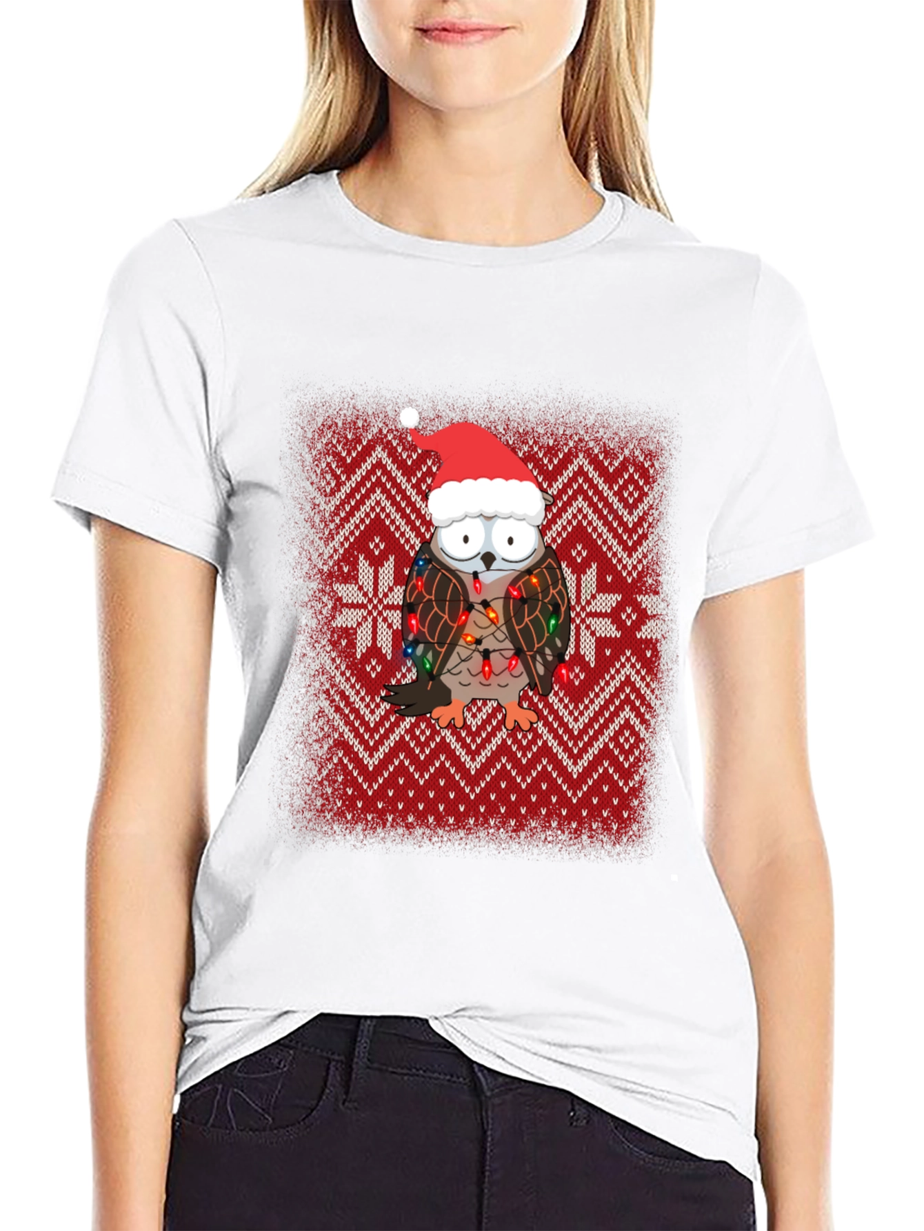Spread holiday cheer with this unique t-shirt! The design features an adorable owl wearing a Santa hat and adorned with Christmas lights, set against a festive red and white patterned background reminiscent of a cozy knit sweater. This eye-catching design is perfect for Christmas parties, holiday gatherings, or simply showing off your love for the season. Made from comfortable fabric, this t-shirt is ideal for everyday wear throughout the holiday season. Get yours today and make a statement this Christmas!