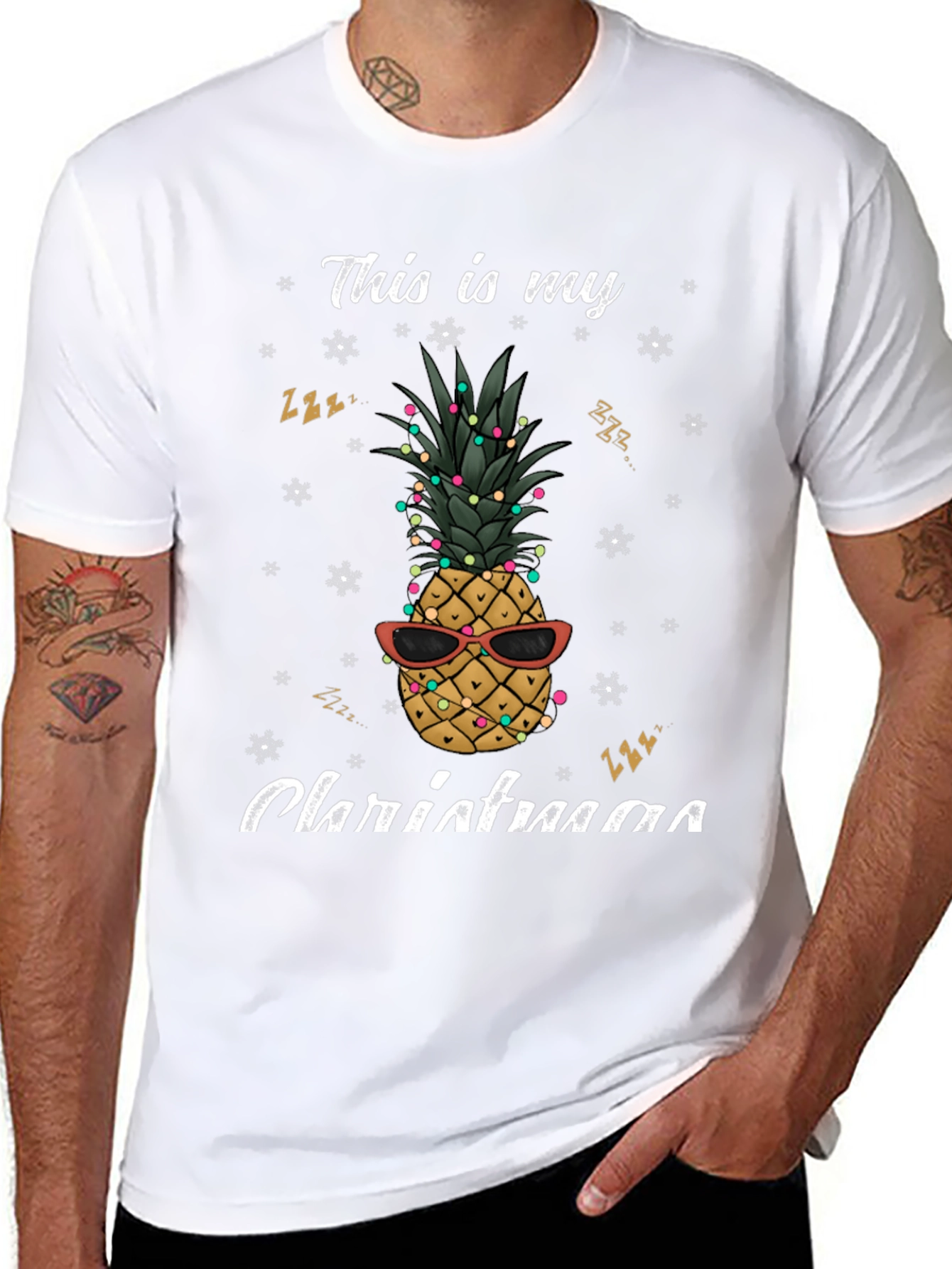 Get into the holiday spirit with this unique Christmas t-shirt. The black tee features a fun design of a pineapple wearing sunglasses, decorated with Christmas lights, and snow flakes around. The whimsical print adds a tropical twist to traditional holiday attire. Made from comfortable fabric, this shirt is perfect for casual gatherings, holiday parties, or just spreading some festive cheer. It's a fun and quirky way to celebrate the season. A great gift for those who love a bit of humor with their Christmas.