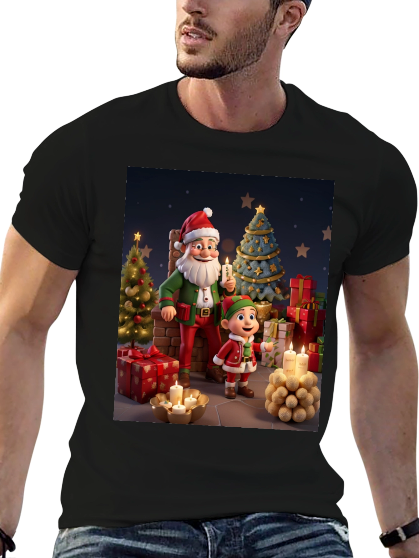 Spread holiday cheer with this adorable Christmas-themed t-shirt! Featuring a cheerful Santa Claus alongside a cute elf in a festive setting with Christmas trees, presents, and candles. This shirt is perfect for Christmas parties, family gatherings, or simply showing off your holiday spirit. The vibrant colors and joyful design make it a standout piece. It’s comfortable, stylish, and bound to bring smiles wherever you go. Get yours today and make this holiday season extra special!