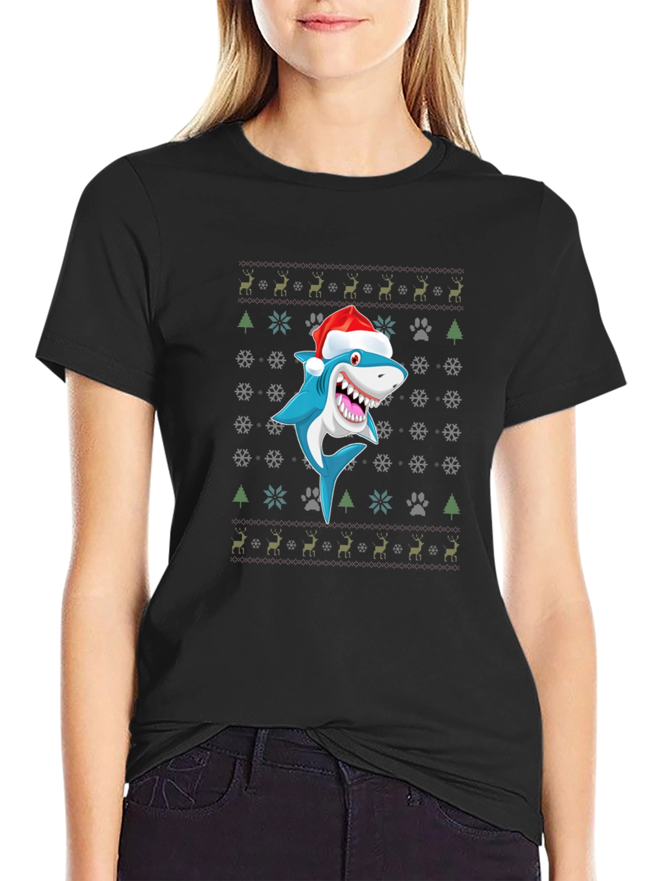 Get ready for the holidays with this fun and quirky black t-shirt featuring a cartoon shark wearing a Santa hat. The unique design incorporates a festive Christmas pattern with snowflakes, reindeer, Christmas trees, and paw prints, creating a playful and eye-catching look. Made from a comfortable-looking fabric, this t-shirt is perfect for casual wear during the holiday season, Christmas parties, or as a novelty gift for shark lovers. Show off your holiday spirit with a touch of humor in this unique Christmas-themed tee!