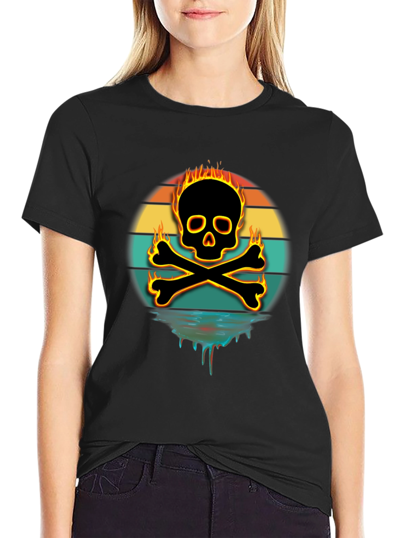 Ignite your style with this striking black t-shirt featuring a bold graphic design. A flaming skull and crossbones emblem takes center stage, set against a retro-inspired sunburst backdrop. The design has melting color for an eye catching appearance. Perfect for casual wear, concerts, or expressing your unique personality. Made from comfortable and durable fabric, this tee is a must-have for anyone who loves edgy, eye-catching apparel. Stand out from the crowd and make a statement with this awesome graphic tee!