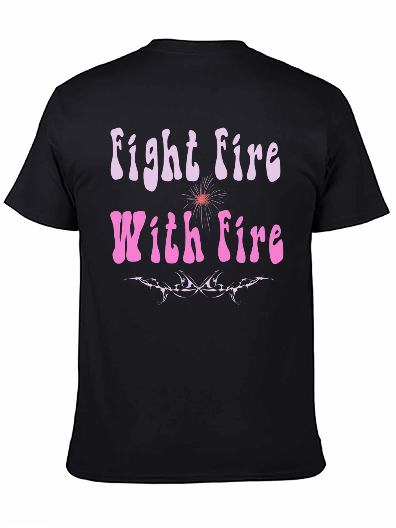 Make a statement with this bold black t-shirt featuring the text "Fight Fire With Fire" in stylized pink font. Above and below the text are unique decorative graphics that add to the shirt's edgy appeal. The classic fit makes it a versatile addition to any wardrobe, perfect for casual outings, concerts, or expressing your unique style. Made from comfortable fabric, this tee ensures all-day comfort while showcasing a powerful message. Pair it with jeans, shorts, or a skirt for an effortlessly cool look. Get yours today and ignite your style!