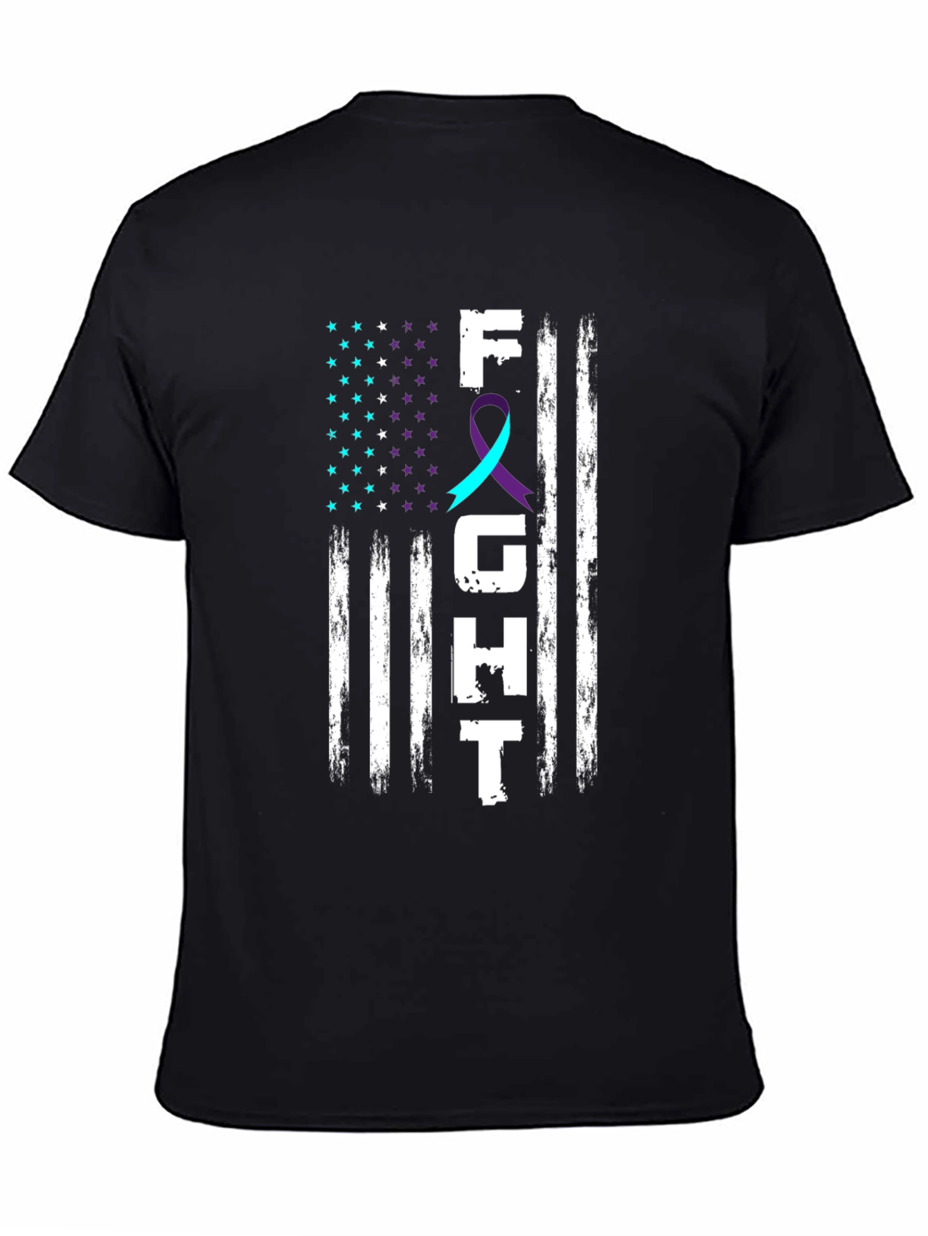 Show your support with this bold black t-shirt featuring a distressed American flag design. The flag is filled with blue and purple stars, symbolizing hope and remembrance. The word "FIGHT" is emblazoned vertically down the center, alongside a teal and purple ribbon, representing suicide awareness. Made from comfortable material, this tee is perfect for raising awareness and starting conversations. Wear it to walks, fundraisers, or as a daily reminder to support mental health. A stylish way to make a meaningful statement.