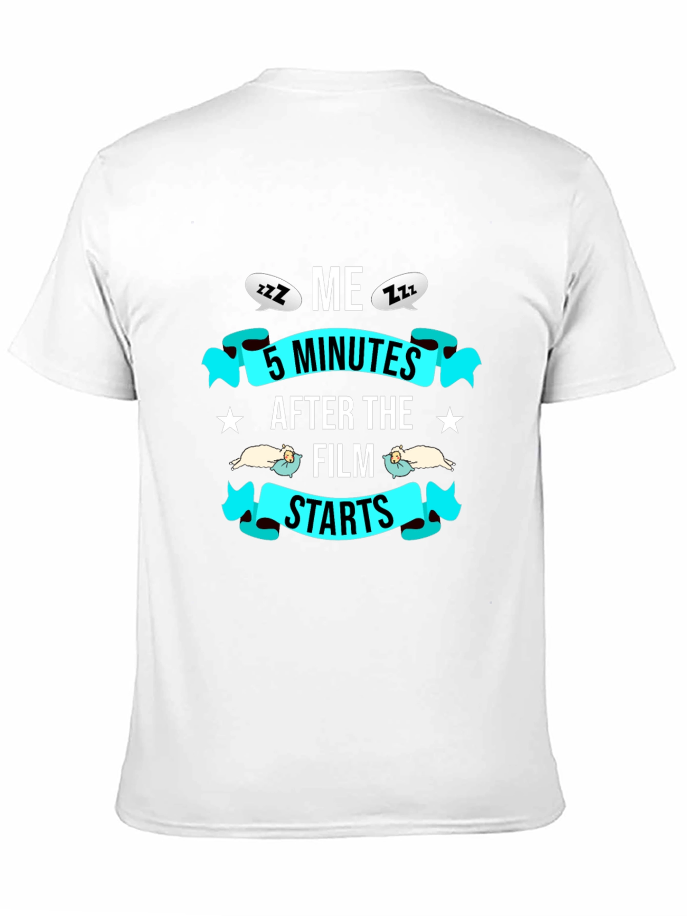 Enjoy this funny graphic tee featuring the words "ME 5 MINUTES AFTER THE FILM STARTS" and sleeping sheep, perfect for movie lovers who are always sleepy. This tee is made from comfortable black fabric, ideal for everyday wear. The design features eye-catching blue banner and star details. Great for casual outings, movie nights, or as a gift for someone who loves to nap. Show off your sense of humor with this unique and relatable t-shirt!