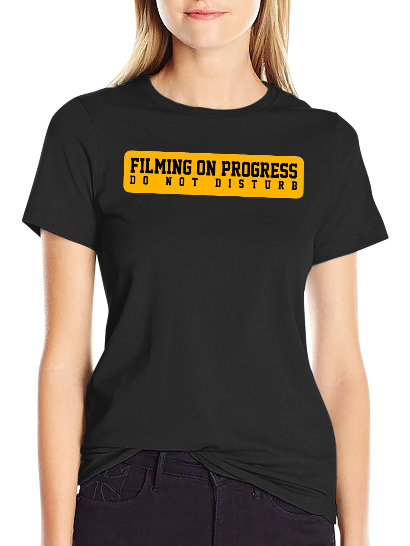 Get ready for your next film set adventure with this stylish black t-shirt. Featuring a vibrant "FILMING ON PROGRESS - DO NOT DISTURB" graphic on the chest, this shirt is perfect for film crew members, actors, or anyone who loves the movie-making process. The bold yellow text on a black background is sure to catch attention and clearly communicate the message. Made from comfortable and breathable fabric, this tee is ideal for long days on set or casual wear. Let everyone know you're in the middle of capturing cinematic magic with this unique t-shirt.