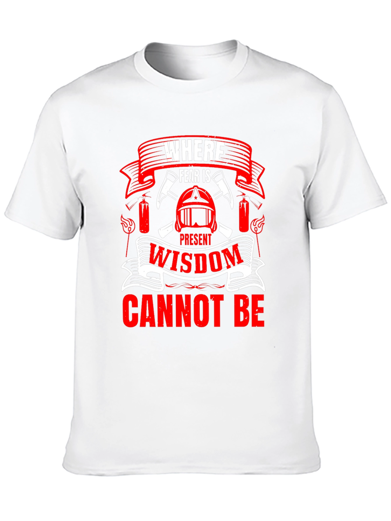 Show your support for firefighters with this bold graphic tee. Featuring a striking design, the shirt displays the saying "Where Fear Is Present Wisdom Cannot Be," surrounded by axes and a firefighter's helmet. The vibrant red and white print pops against the black fabric, making a statement. Constructed from comfortable, breathable material, this tee is perfect for everyday wear. Ideal for firefighters, their families, or anyone who admires their courage, this tee makes a thoughtful gift. Express your appreciation with this unique and eye-catching design.