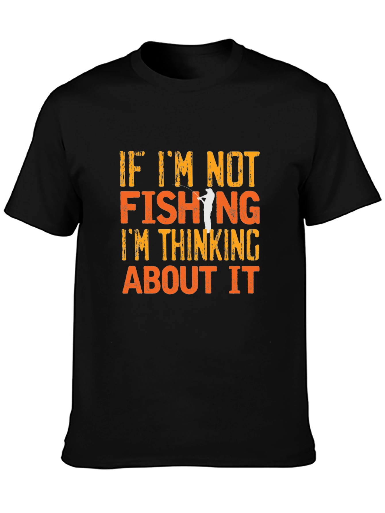 This black graphic t-shirt is perfect for fishing enthusiasts. The shirt features an eye-catching design with the phrase "IF I'M NOT FISHING I'M THINKING ABOUT IT" printed in a distressed orange font. A silhouette of a person fishing is incorporated into the design. Made from a comfortable-looking fabric, this tee offers both style and comfort. Ideal for casual wear, fishing trips, or as a gift for the angler in your life. Show off your passion for fishing with this unique and stylish t-shirt.