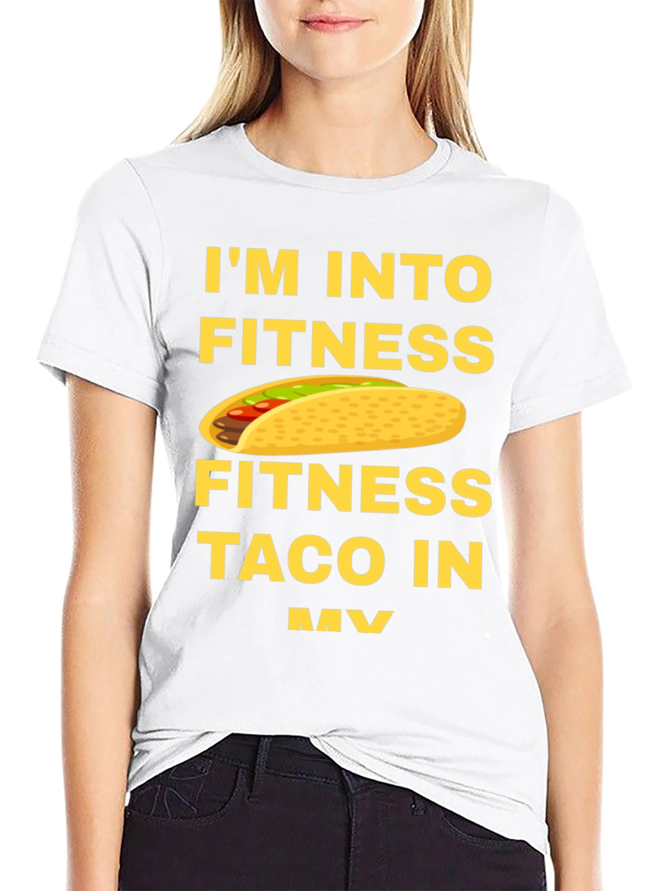 Show off your love for fitness and tacos with this unique graphic tee! The black t-shirt features a playful design with the phrase 'I'm into fitness, fitness taco in my...' in a bold yellow font. A delicious-looking taco illustration adds a fun touch to the shirt. Made from a soft, comfortable fabric, this tee is perfect for workouts, casual outings, or just lounging around. Express your playful personality and grab one today!