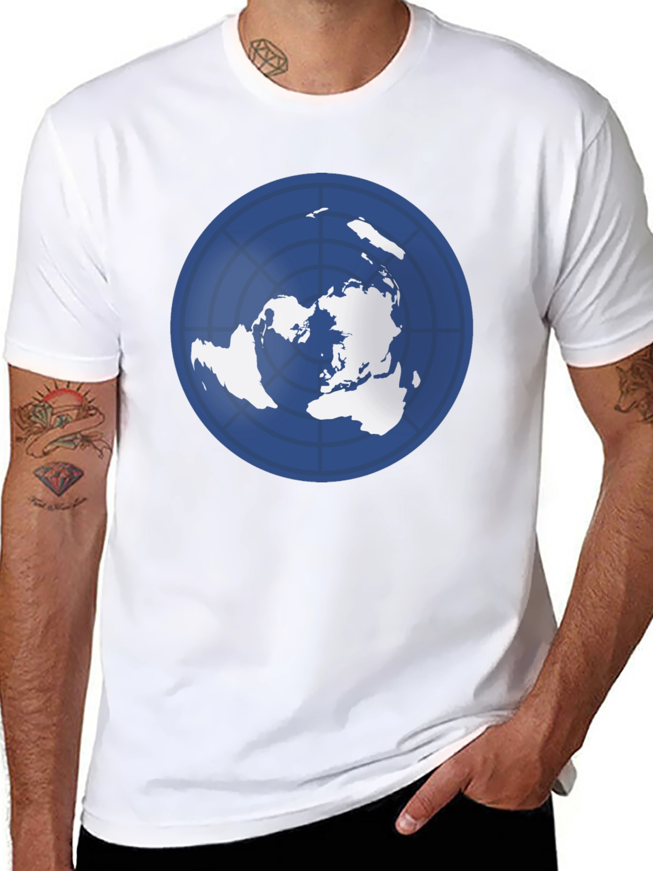 Showcase your unique perspective with this eye-catching black t-shirt featuring a distinctive flat earth map design. The graphic is rendered in a striking blue and white color palette, creating a bold contrast against the shirt's dark background. Made from a comfortable, breathable fabric, this tee is perfect for casual wear and sparking conversation. Wear it to express your individual style, make a statement, or simply enjoy the intriguing design. The durable print ensures long-lasting vibrancy, making this t-shirt a standout addition to any wardrobe. Ideal for everyday wear, meetups, or as a unique gift for the unconventional thinker.