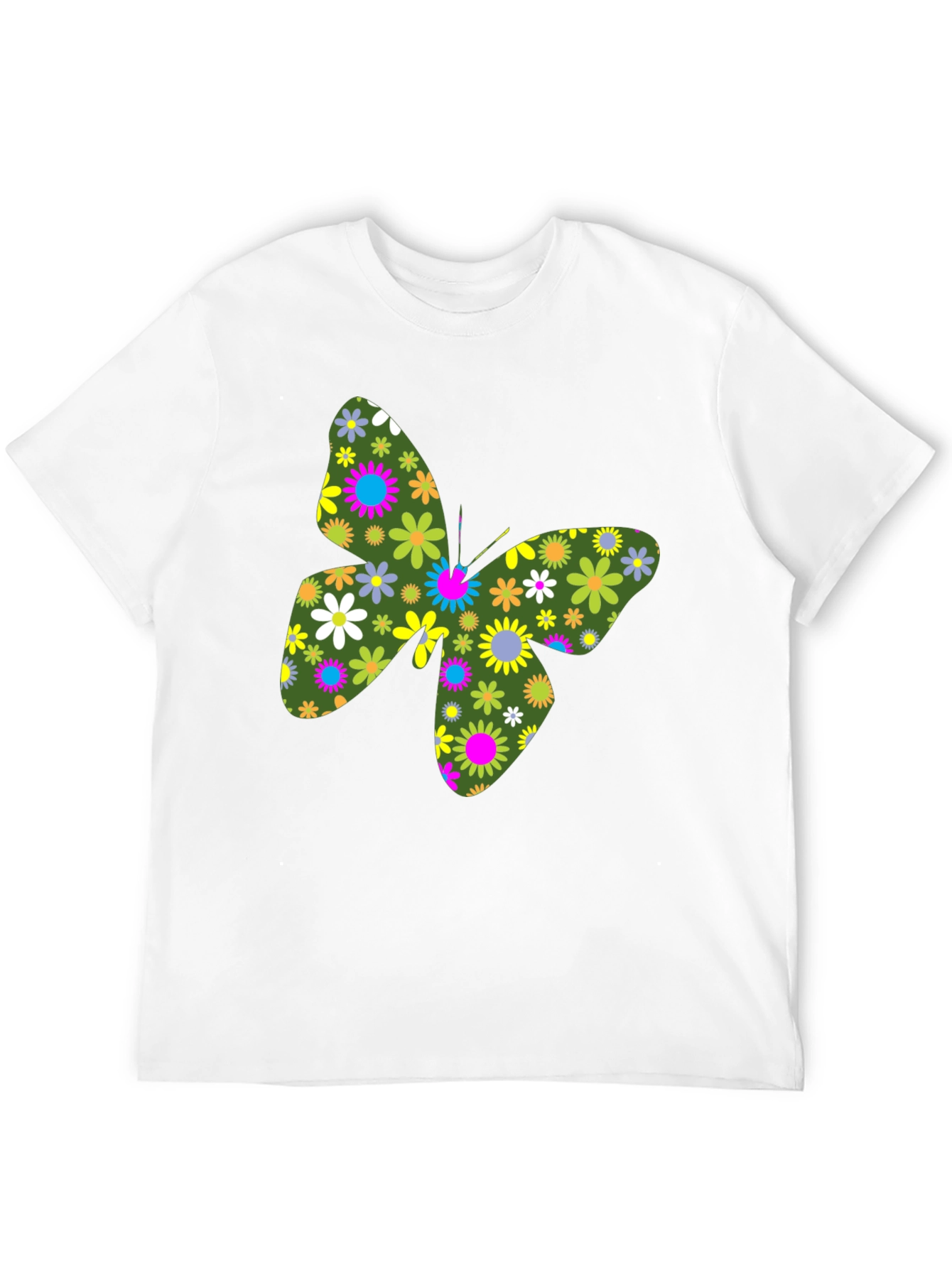 Elevate your casual wardrobe with this eye-catching black t-shirt. Featuring a vibrant, floral-patterned butterfly graphic, this shirt adds a touch of nature-inspired style to any outfit. The colorful flowers within the butterfly design create a playful and unique look, making it a standout piece. Made from a comfortable fabric, this t-shirt is perfect for everyday wear. Pair it with jeans or shorts for a relaxed yet fashionable ensemble. This shirt is ideal for adding a pop of color and personality to your wardrobe.