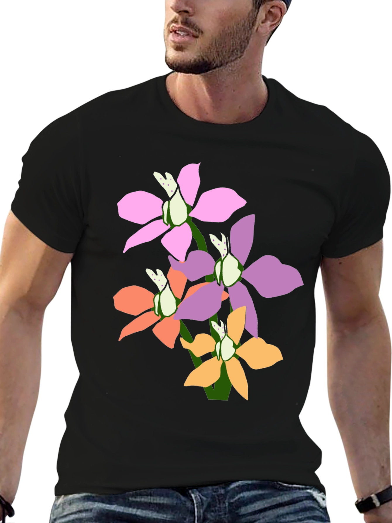 Elevate your casual wardrobe with this stylish black t-shirt. The shirt features a vibrant floral graphic design, with blossoms in a range of colors including pink, orange, and purple. The artistic design makes this tee a unique and eye-catching piece. Crafted from a soft, breathable fabric, this tee offers all-day comfort and easy wear. Perfect for adding a touch of color and personality to any outfit, this graphic tee is ideal for casual outings, weekend adventures, or simply lounging at home. Pair with jeans or shorts for a relaxed, trendy look.