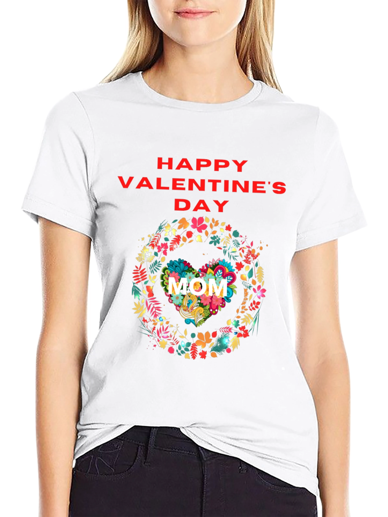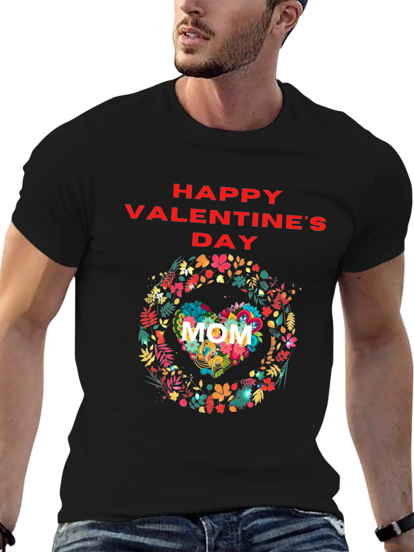 Celebrate Valentine's Day with this unique black t-shirt. Featuring a vibrant, colorful floral heart design, it's a stylish way to show your love for mom. The word 'MOM' is elegantly placed in the center of the heart. The design includes the phrase 'Happy Valentine's Day' in bold red letters above the heart. Made from comfortable materials, this short-sleeved tee is perfect for casual wear, Valentine's Day gatherings, or as a thoughtful gift for a special mother. Show your love in style with this eye-catching t-shirt!