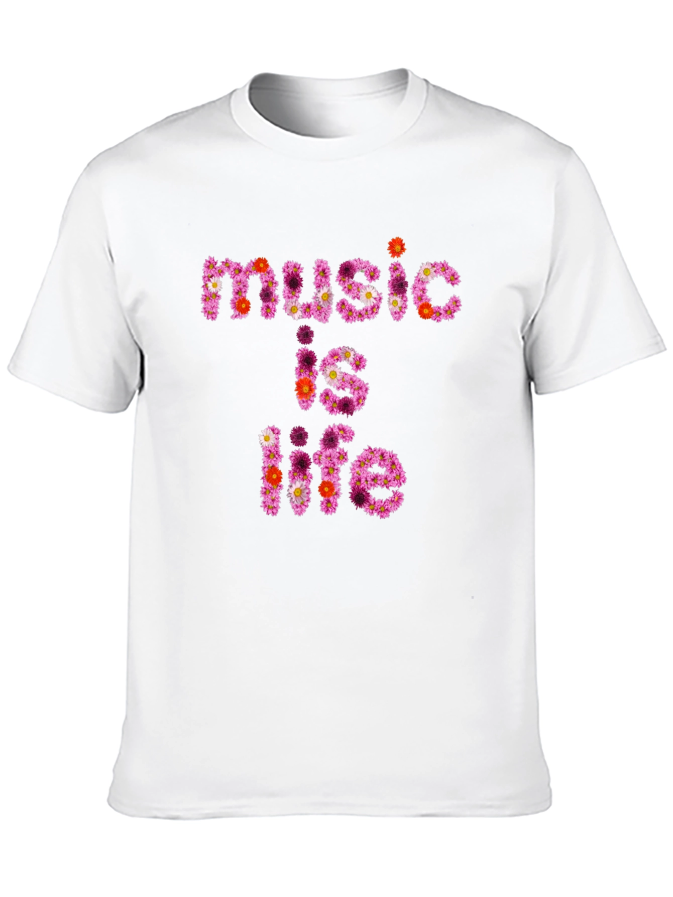 Express your passion with this unique black t-shirt featuring a vibrant floral design that spells out "music is life." This eye-catching shirt is made from a comfortable fabric, perfect for everyday wear. The graphic is composed of colorful pink and orange flowers, creating a cheerful and stylish statement. Ideal for music lovers, festivals, or casual outings, this t-shirt is a must-have addition to your wardrobe. Make a statement and showcase your love for music and life with this awesome tee. Get yours today!