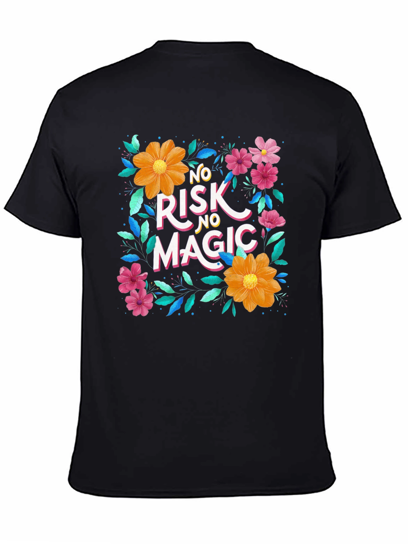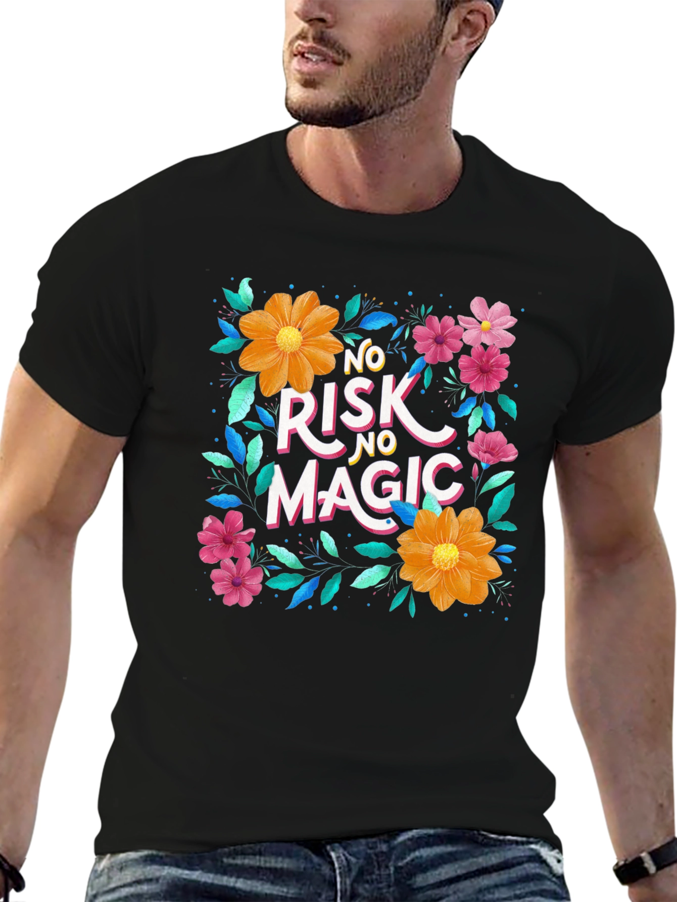 Embrace a bold statement with this eye-catching black t-shirt. The design features vibrant floral graphics surrounding the phrase "No Risk No Magic," creating a visually striking and inspirational piece. Made from a comfortable-looking fabric, this tee appears soft, breathable and perfect for everyday wear. The colors are bright and lively, and the print quality looks excellent, suggesting durability and long-lasting appeal. This t-shirt is ideal for casual outings, social gatherings, or expressing your unique style. Pair it with jeans, shorts, or a skirt for a standout look. It's a perfect addition for those who love floral designs and positive affirmations, making a bold statement wherever you go.