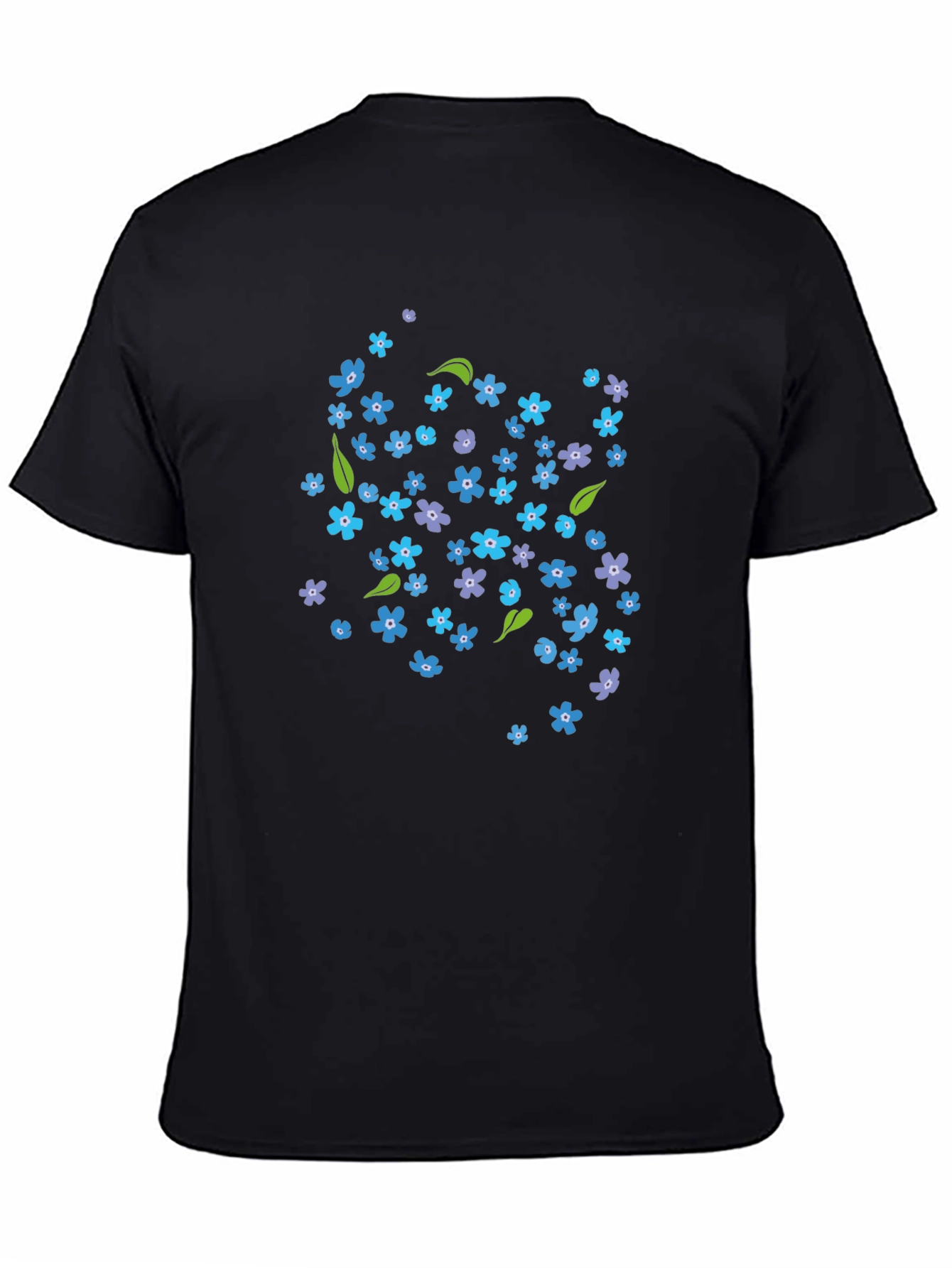 This black t-shirt features a whimsical floral print. The design includes an assortment of small blue and purple flowers, interspersed with green leaves, creating a visually appealing pattern. The shirt is made from a soft-looking fabric, ideal for casual wear. This t-shirt is perfect for adding a touch of fun to your everyday wardrobe. It's great for relaxed outings, casual gatherings, or simply lounging at home. The classic crew neck and short sleeves offer a comfortable and versatile fit. This unique floral print makes a charming and stylish statement.