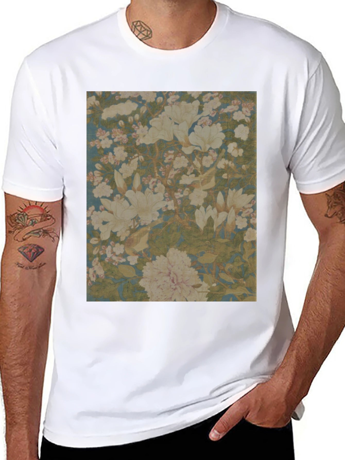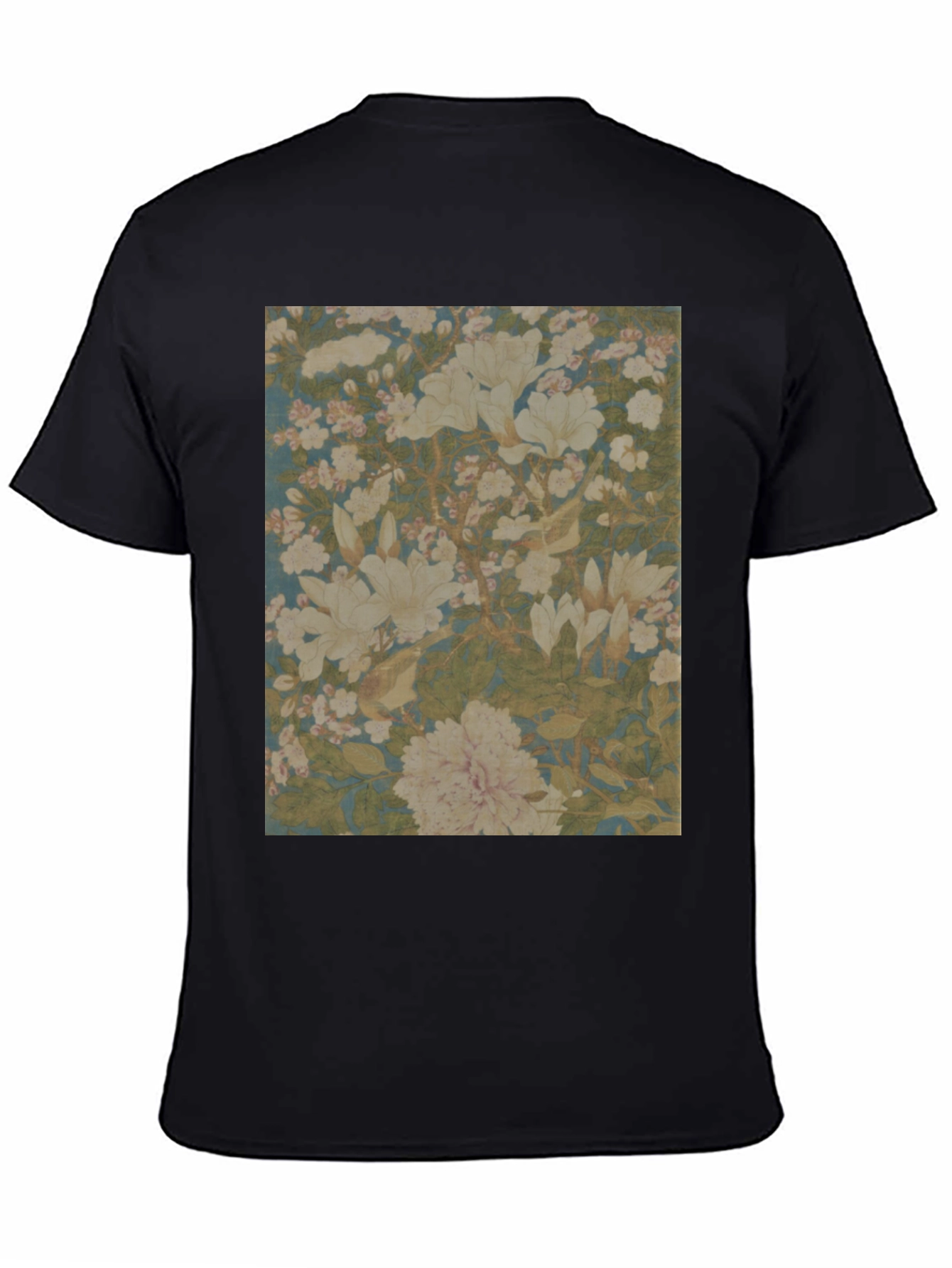 Elevate your style with this unique floral print tee. This black, short-sleeved t-shirt features a detailed floral pattern in soft hues that evokes a vintage aesthetic. The design showcases a blend of white and pink blossoms intertwined with leafy details, creating a sophisticated and eye-catching look. Crafted from a comfortable cotton fabric, this tee offers a relaxed fit perfect for everyday wear. Pair it with jeans for a casual outing or dress it up with chinos for a more refined ensemble. Ideal for those who appreciate art-inspired fashion, this floral print tee is a versatile addition to any wardrobe.
