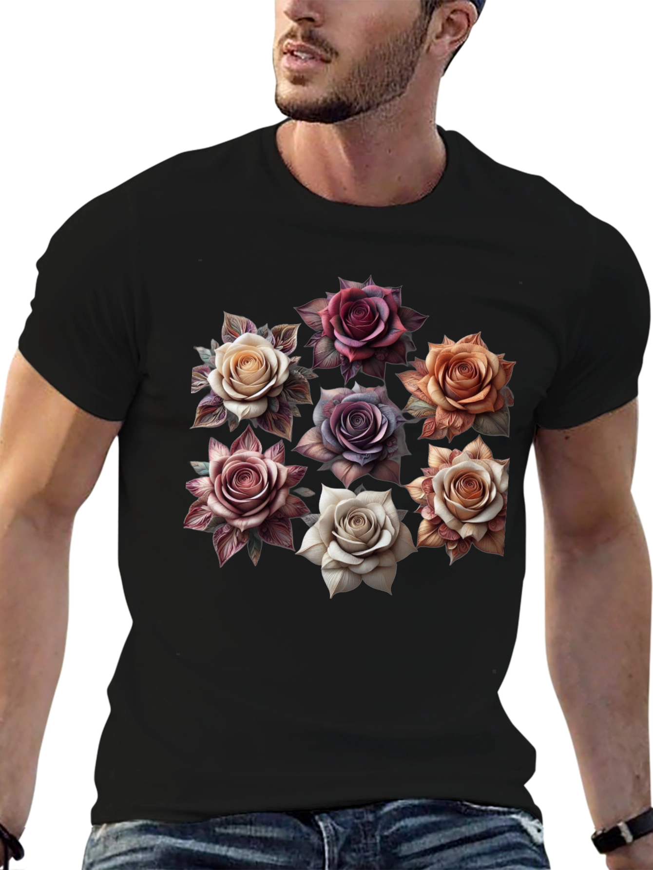 Elevate your everyday style with this striking floral rose t-shirt. Featuring a stunning arrangement of roses in various hues, this tee is a visual delight. The design showcases intricate detailing and a vibrant color palette. Perfect for adding a touch of elegance to your casual look, this t-shirt is made from comfortable, breathable fabric, ensuring all-day comfort. Dress it up with a blazer or keep it casual with jeans - this versatile piece is a must-have for any wardrobe. Make a bold statement and showcase your unique style with this eye-catching rose graphic tee.