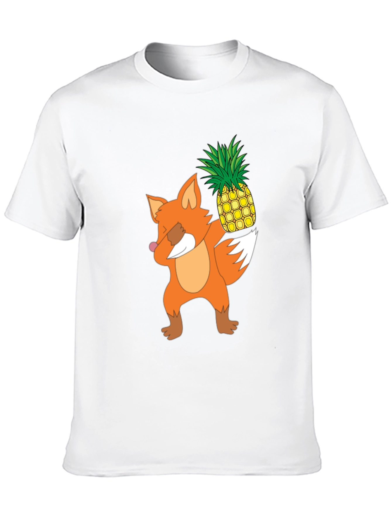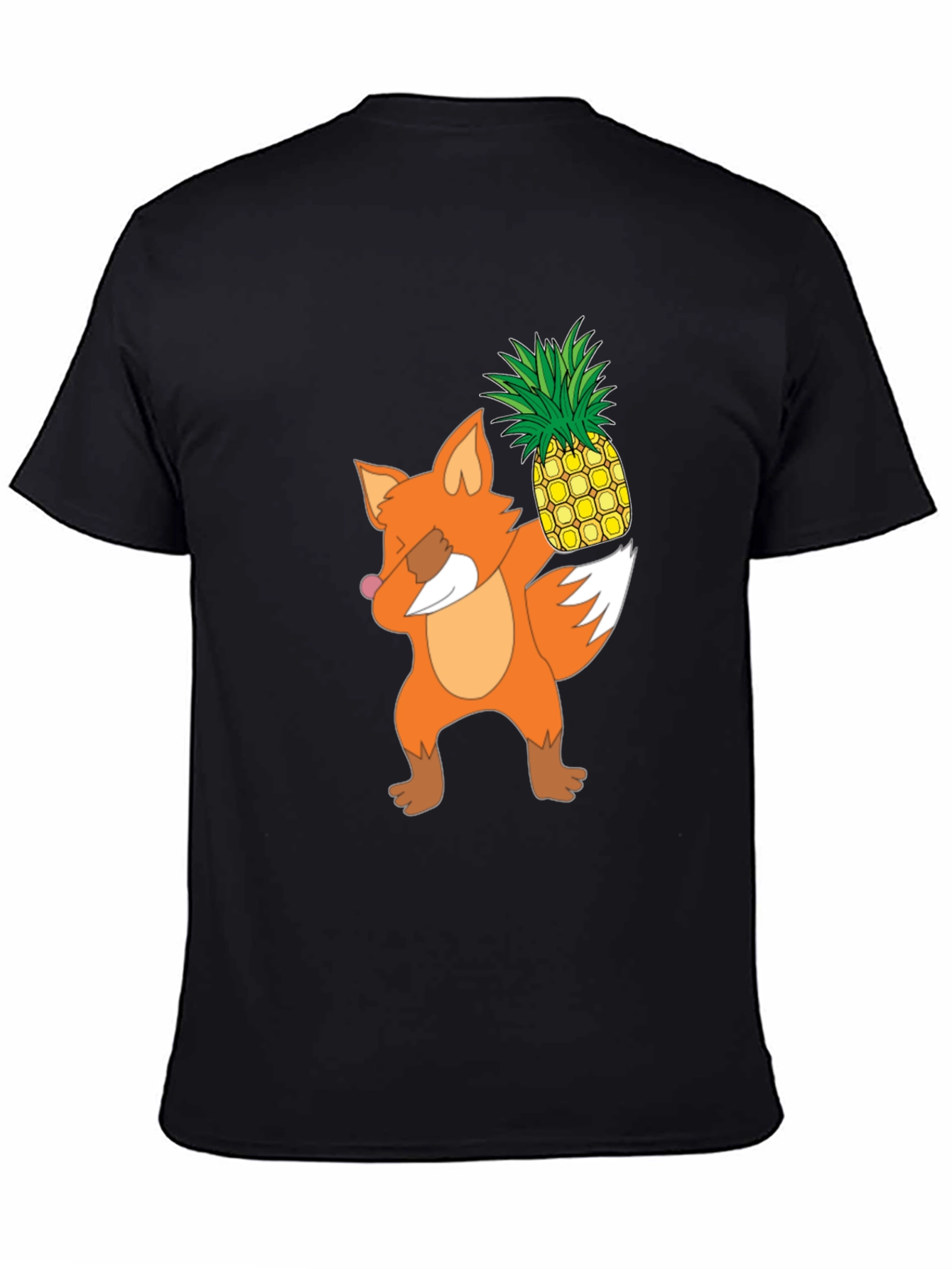 Show off your fun side with this unique t-shirt. It features a cartoon fox graphic dabbing while holding a pineapple. Made from a comfortable material, this black tee is perfect for everyday wear. The design stands out vibrantly against the dark background, making it an eye-catching piece. Wear it casually with jeans, or dress it up with a jacket. Ideal for animal lovers, fruit enthusiasts, or anyone looking for a conversation starter. Makes a great gift too!