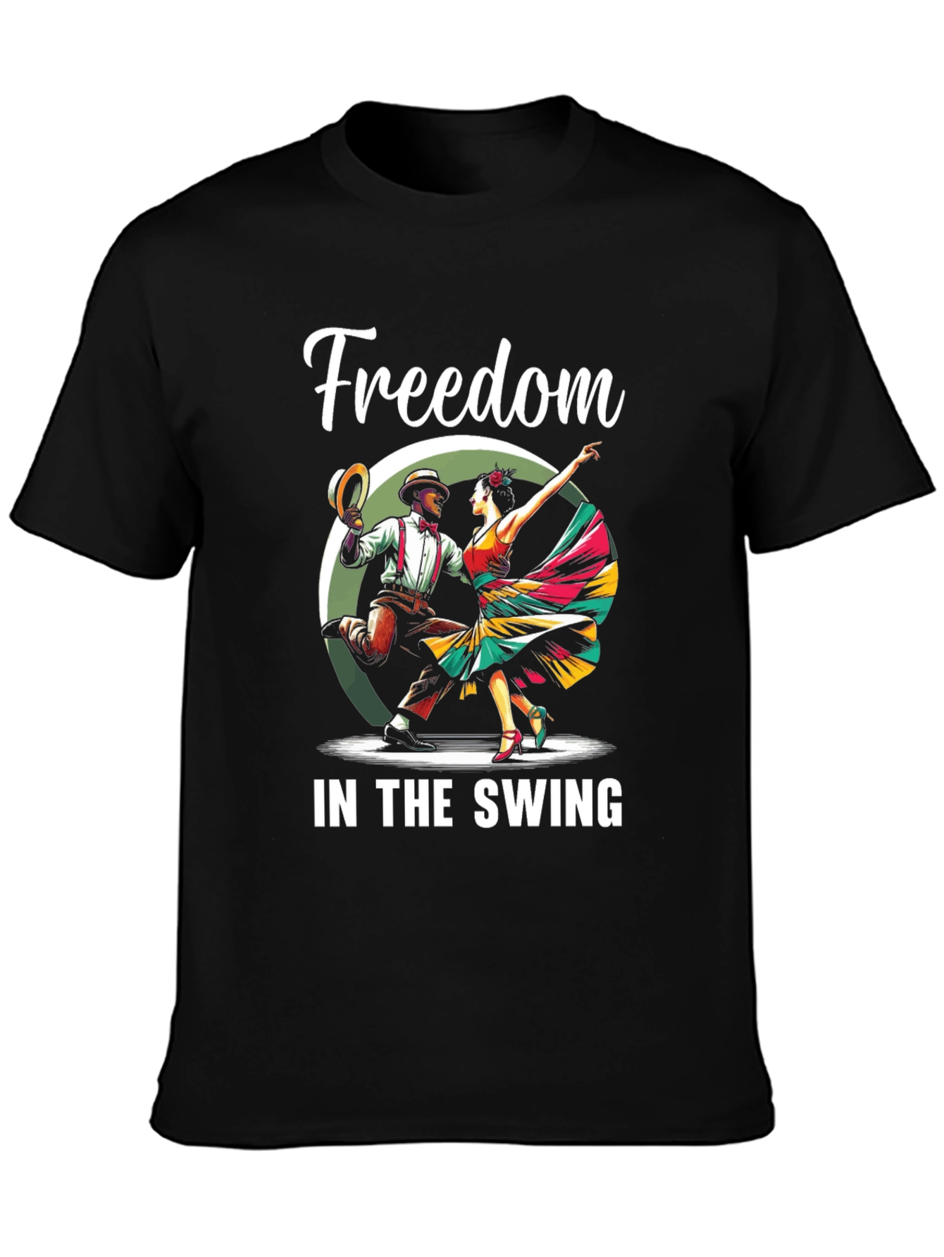 Show off your love for swing dancing with this stylish black t-shirt. The design features two dancers in a vibrant, retro style, with the words "Freedom IN THE SWING" in bold white lettering. Made from comfortable material, this tee is perfect for wearing to dance classes, social events, or just expressing your passion for dance in everyday life. A great gift for dancers and music lovers alike. Get ready to swing in style!