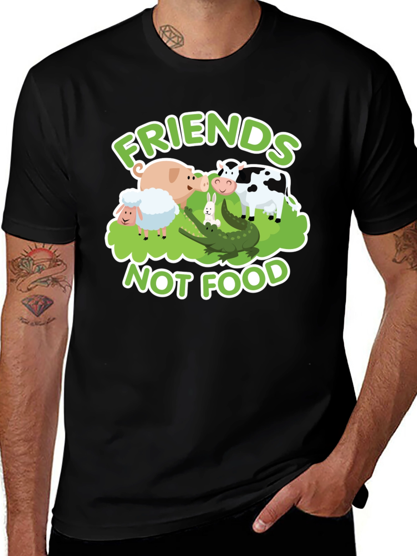 Show your love for animals with this adorable "Friends Not Food" T-shirt! This black tee features a charming cartoon graphic of a pig, sheep, cow, rabbit and alligator, all smiling happily together in a green pasture. The message "Friends Not Food" is printed in bold green lettering, making it clear where you stand. Made from a soft, comfortable fabric, this shirt is perfect for everyday wear or for making a statement at your next vegan potluck. It's a great way to spark conversation and promote a compassionate lifestyle. Let your wardrobe reflect your values!