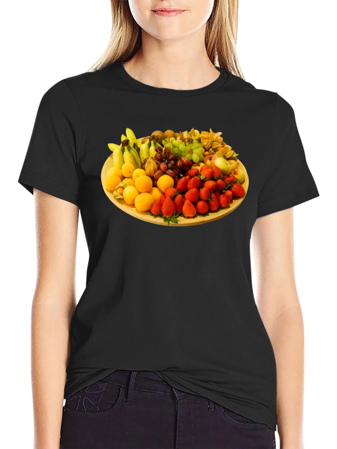 This eye-catching t-shirt features a vibrant graphic of a delicious fruit platter. The design showcases an assortment of fresh fruits including bananas, grapes, strawberries, and more, all arranged on a wooden platter. Made from a soft, breathable black fabric, this tee offers both comfort and style. The unique design makes it a great conversation starter and a fun addition to any casual wardrobe. Perfect for fruit lovers, foodies, or anyone who appreciates a creative and colorful print. Wear it to the gym, out with friends, or simply relaxing at home. Grab yours today!