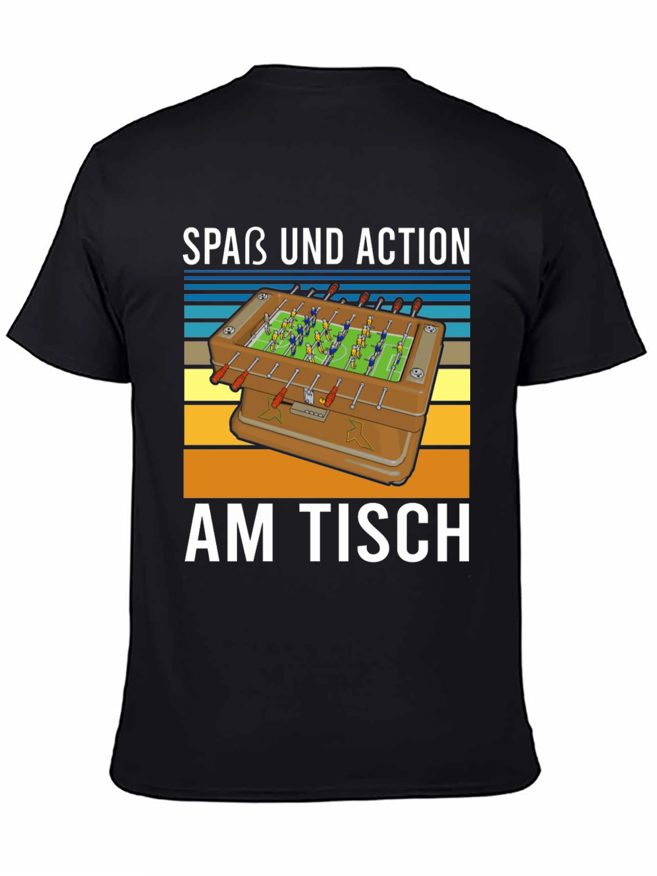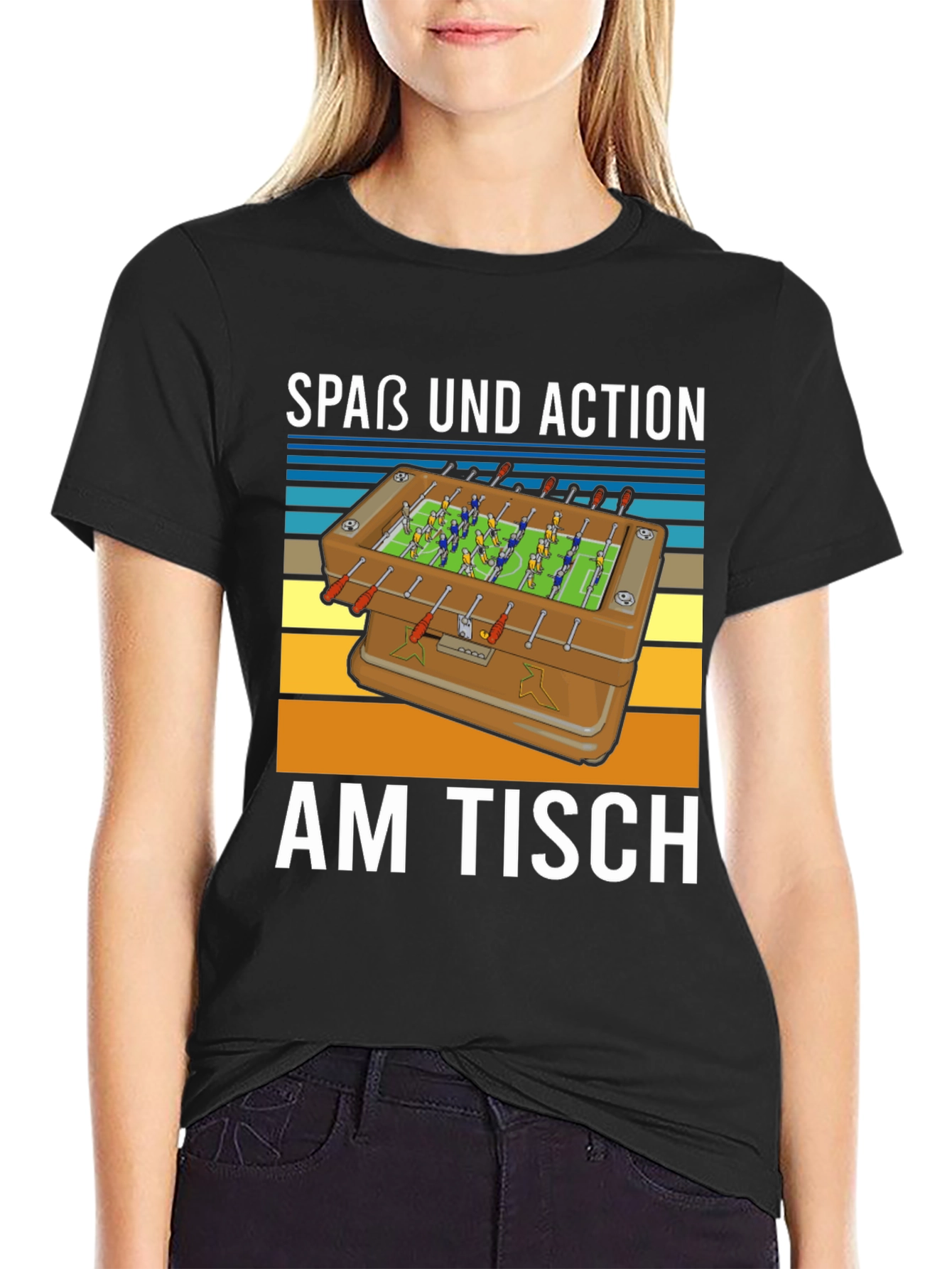Show off your love for foosball with this unique t-shirt! Featuring a vibrant graphic of a foosball table set against a retro sunset background, this shirt is sure to turn heads. The words "SPAB UND ACTION AM TISCH" are printed above and below the graphic, adding a touch of German flair to your wardrobe. The design is printed on a soft, comfortable black t-shirt. Perfect for foosball enthusiasts, casual wear, or a fun gift! Get ready to bring the action to the table!