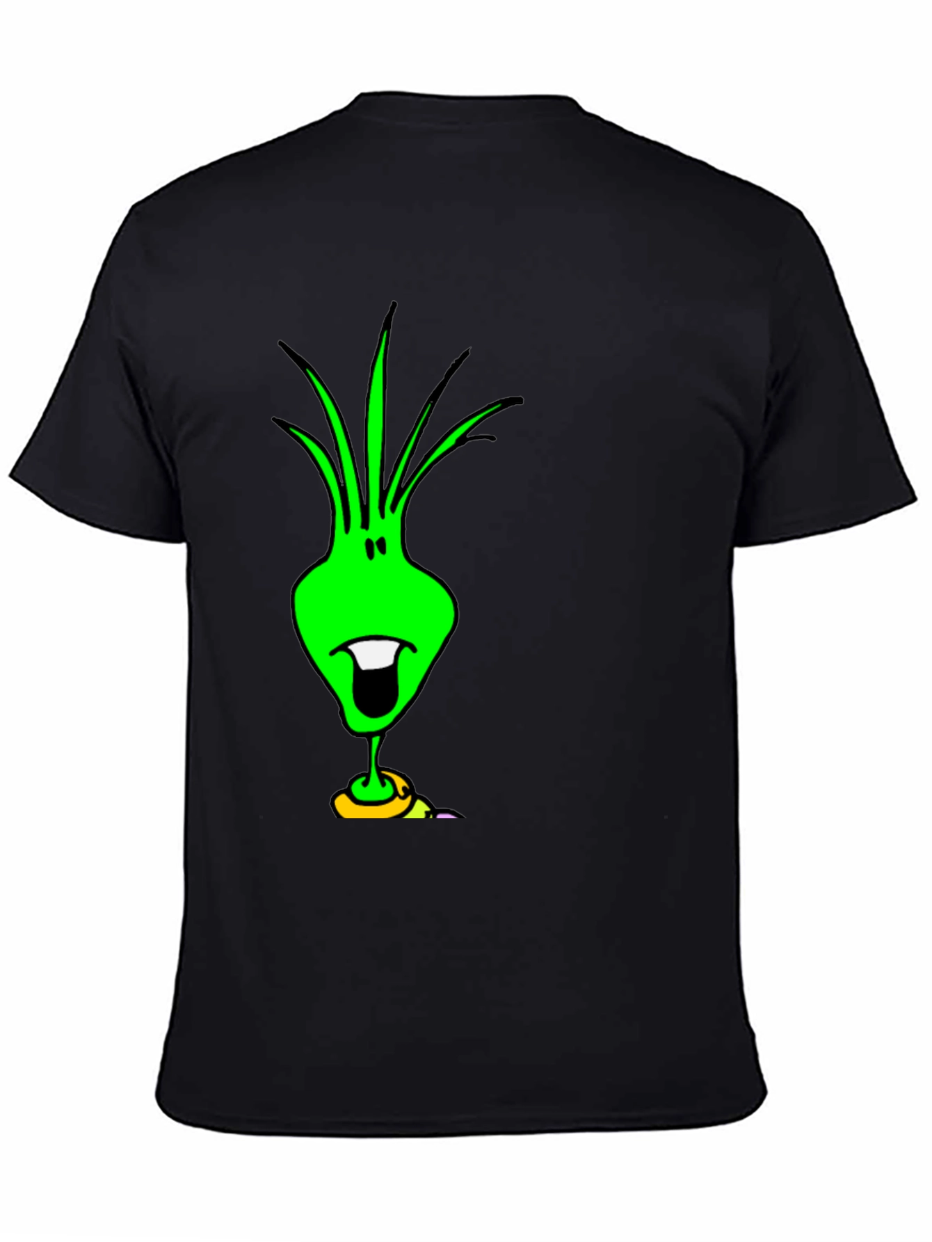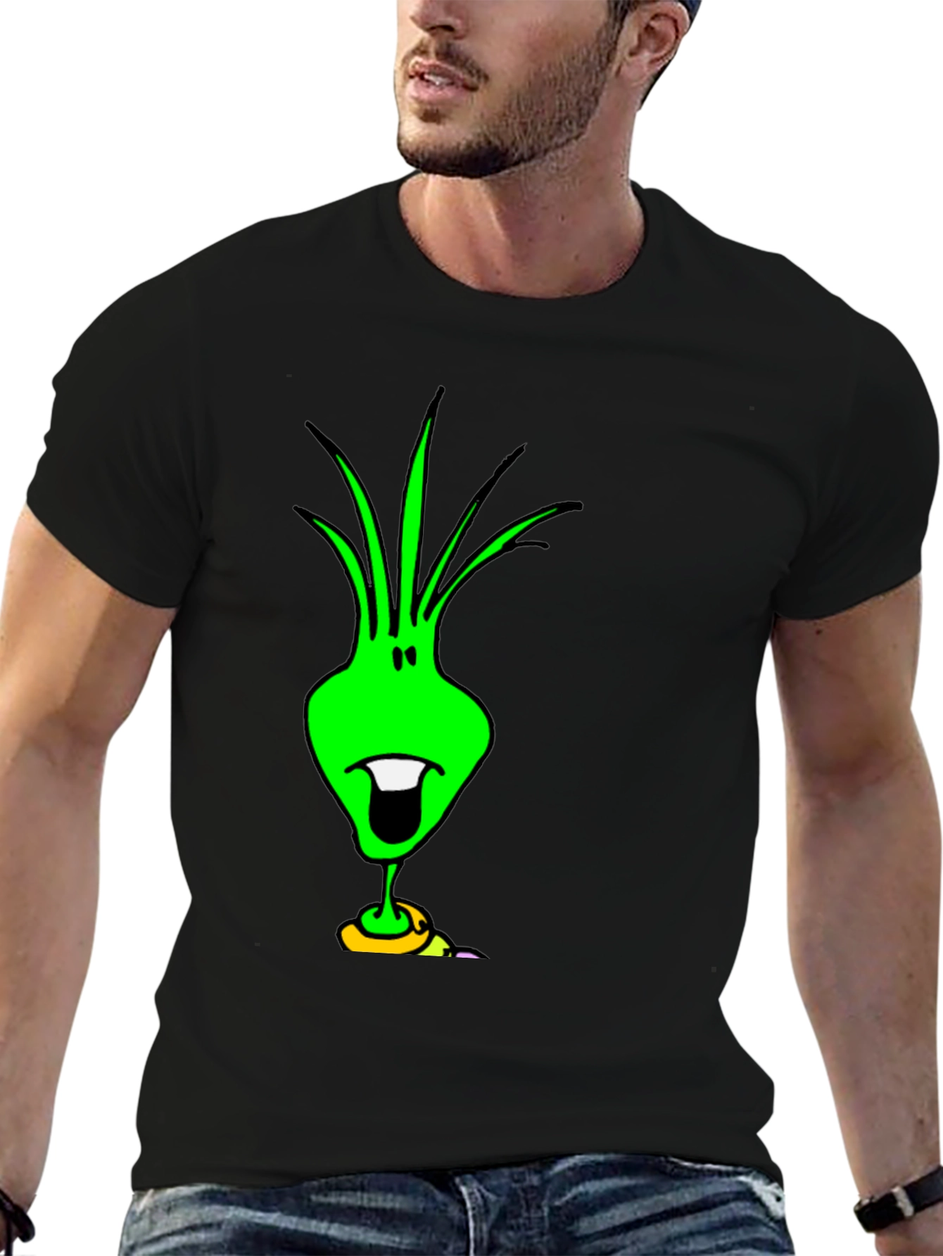 Express your unique style with this eye-catching black cotton t-shirt featuring a quirky green alien graphic. The design showcases a playful alien character with a distinctive sprout-like hairstyle, a wide, toothy grin, and a ring accent near the base. Made from soft and breathable cotton, this tee offers all-day comfort and a relaxed fit. It's perfect for casual outings, concerts, or just lounging around at home. Stand out from the crowd and add a touch of humor to your wardrobe with this conversation-starting t-shirt. Makes a great gift for sci-fi fans and anyone with a fun-loving personality.