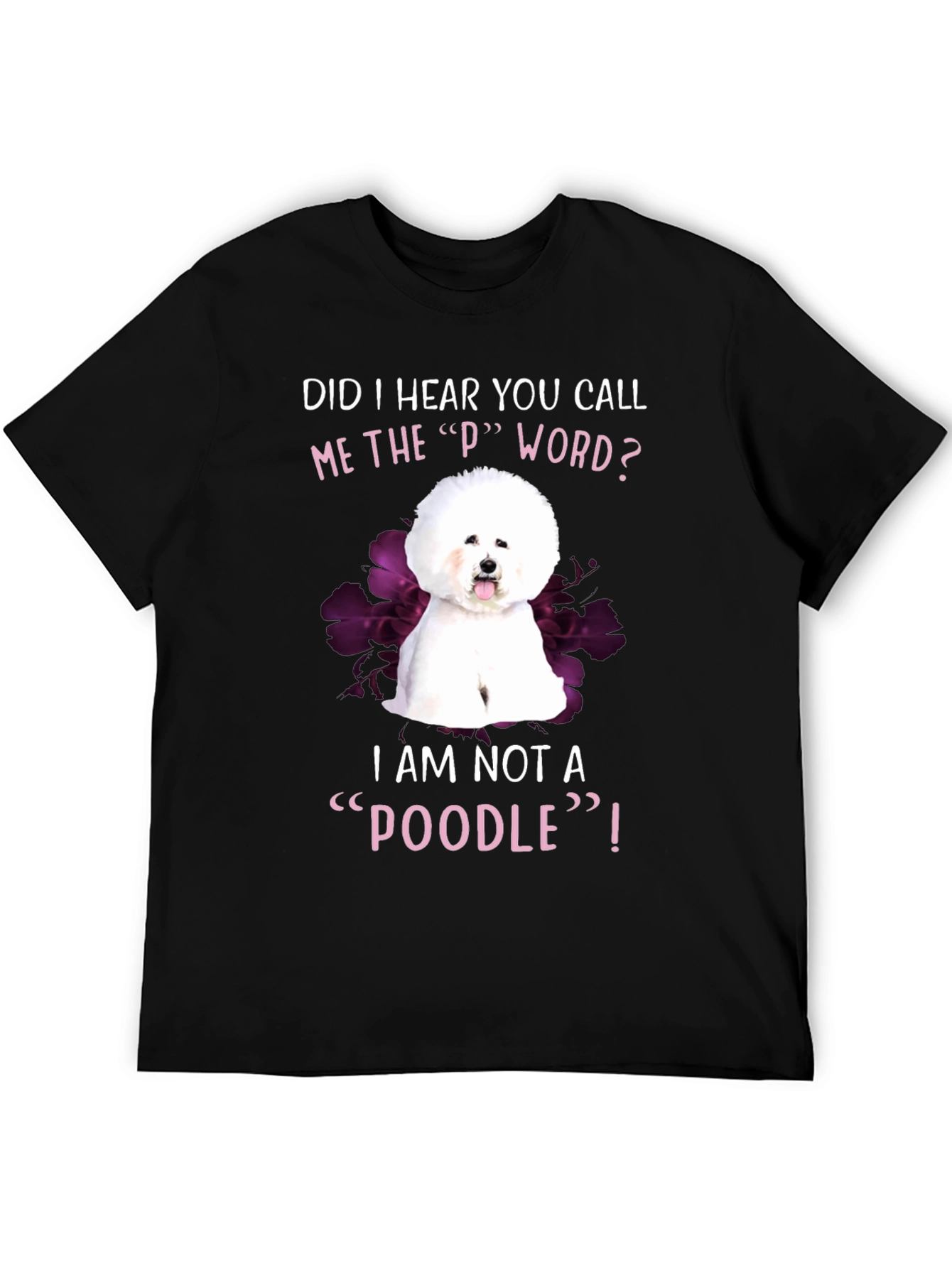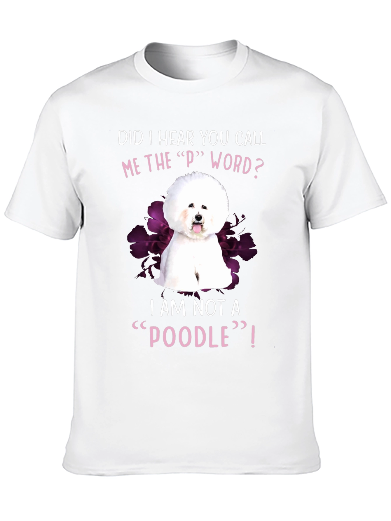 This black graphic t-shirt features a fluffy white Bichon Frise dog with pink floral accents and humorous text. The playful design states, "DID I HEAR YOU CALL ME THE 'P' WORD?" above the dog, and "I AM NOT A 'POODLE'!" below, making it a fun conversation starter. Perfect for dog lovers with a sense of humor, this t-shirt is ideal for casual wear, dog park outings, or as a quirky gift for a Bichon Frise owner. Show off your unique style with this comfortable and eye-catching tee.