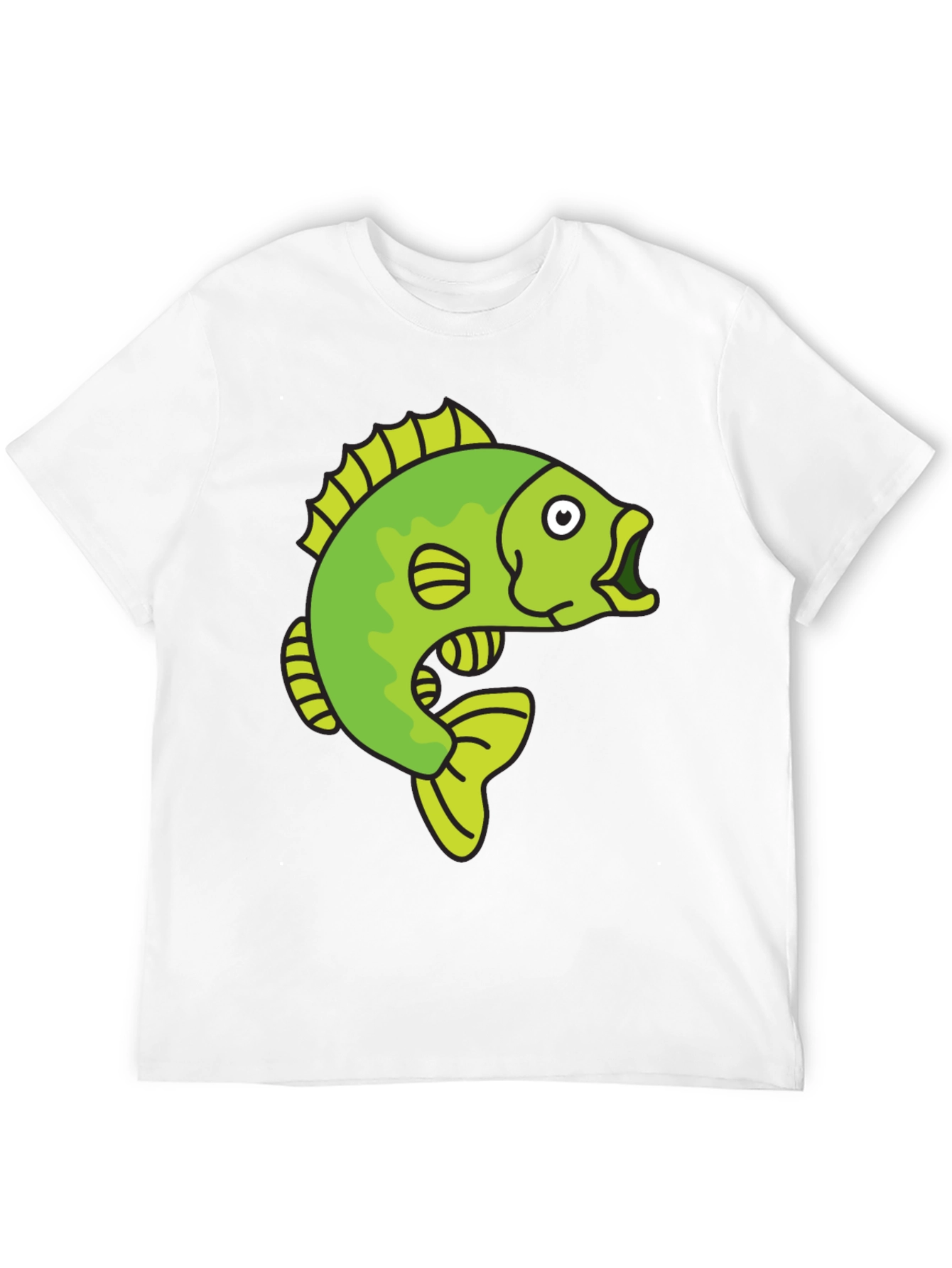 Show off your playful side with this eye-catching black t-shirt. It features a vibrant, cartoon-style graphic of a green fish. The design is bold and fun, making it a great conversation starter. Made from a comfortable material, this tee is perfect for casual outings, fishing trips, or simply relaxing at home. The classic fit and short sleeves make it a versatile addition to any wardrobe. Express your unique style and add a touch of whimsy with this unique fish t-shirt.