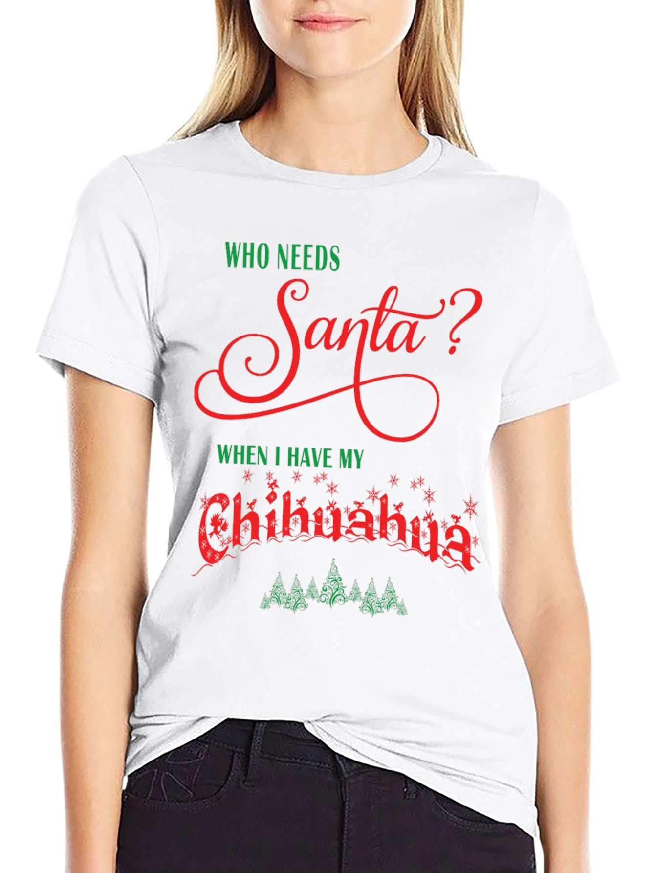 Spread some holiday cheer with this fun and festive black t-shirt. The design features the phrase "Who Needs Santa? When I have my Chihuahua" in green and red lettering. The playful design also includes a line of Christmas tree graphics to complete the holiday theme. This t-shirt is perfect for Chihuahua owners with a sense of humor, Christmas parties, casual holiday gatherings, or everyday wear. Get ready to spread some smiles and laughter with this unique holiday apparel!
