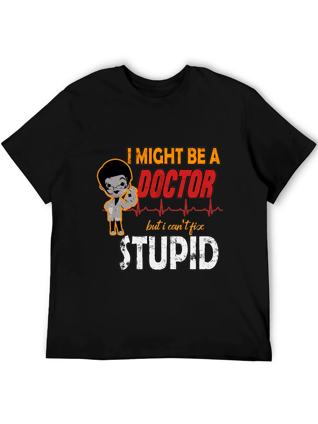 Show off your medical humor with this unique t-shirt! This black tee features a cartoon doctor design, along with the funny saying "I Might Be A Doctor but I Can't Fix Stupid." The graphic has red and orange accents, adding a pop of color to the design. Made from comfortable, breathable fabric, this shirt is perfect for casual wear or as a fun gift for doctors and medical professionals with a sense of humor. Wear it to work, school, or out with friends to share a laugh and make a statement. Get yours today and let everyone know you appreciate a good joke!