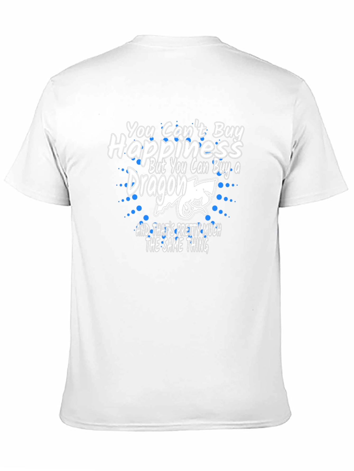 Show off your love for dragons with this unique graphic t-shirt. Featuring a witty saying, "You can't buy happiness but you can buy a dragon and that's pretty much the same thing", this shirt is sure to bring a smile to your face. The eye-catching design includes a dragon silhouette and playful typography. Made from a comfortable black fabric, this tee is perfect for casual wear. Ideal for dragon enthusiasts and anyone with a sense of humor, this t-shirt is a must-have addition to your wardrobe. A great gift idea for friends and family who adore dragons.