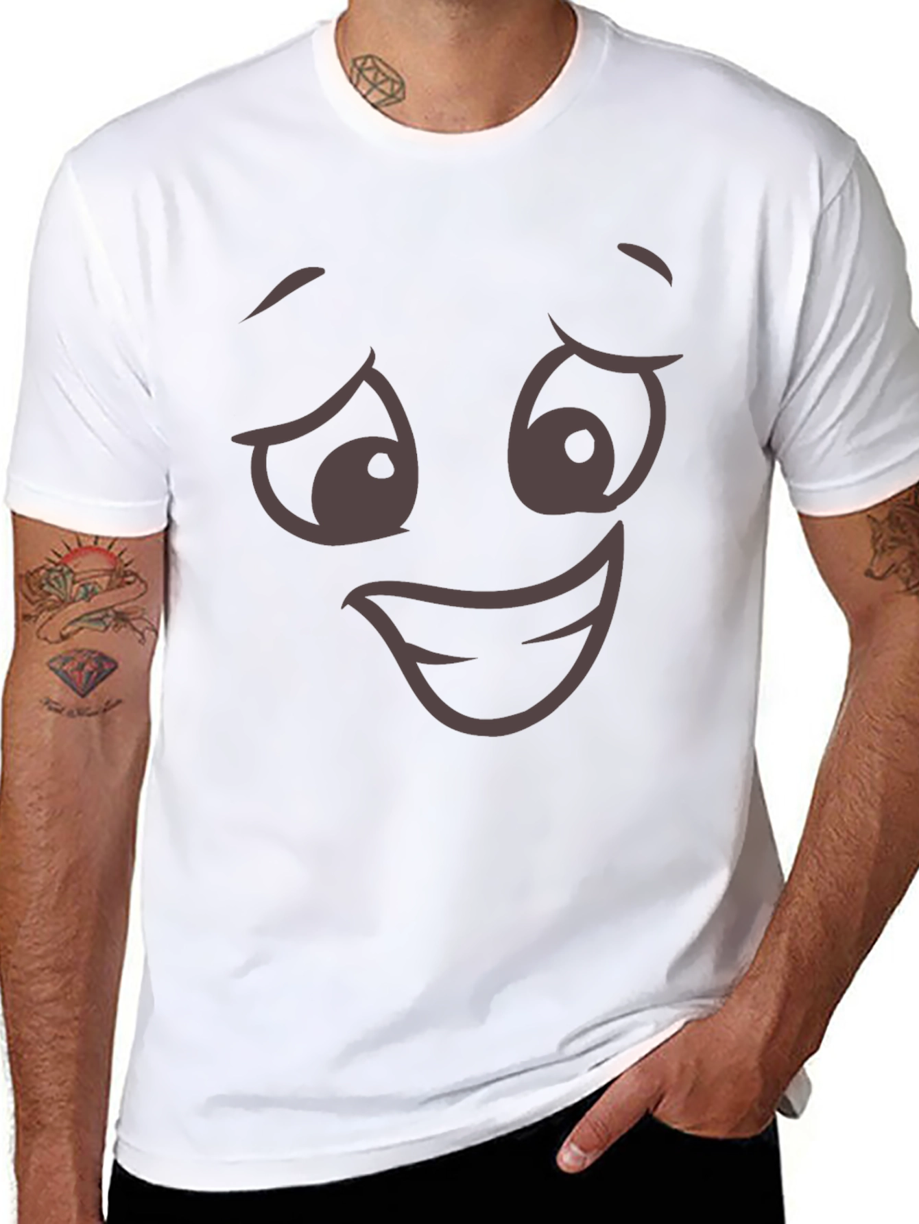 This black unisex t-shirt features a playfully cute cartoon face graphic. The design includes expressive eyes and a charming smile. Made from what appears to be a soft and comfortable fabric, this tee is perfect for casual wear. The shirt has a classic fit with short sleeves, making it versatile for various occasions. This fun and eye-catching t-shirt is ideal for expressing your personality and adding a touch of humor to your wardrobe. Great for everyday wear, parties, or as a unique gift for friends and family. Enjoy style and comfort with this unique tee!