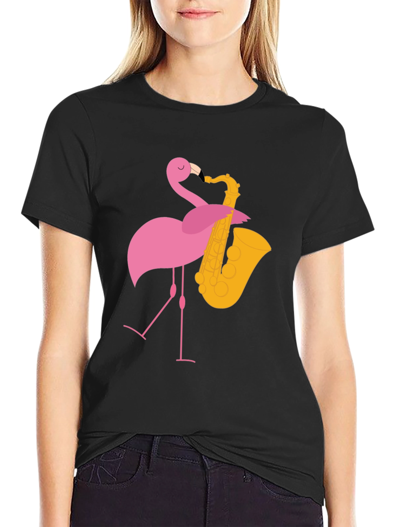 This quirky black t-shirt features a playful graphic of a pink flamingo confidently playing a golden saxophone. The design is sure to bring a smile to anyone's face. Made from what appears to be a comfortable cotton blend, this tee is ideal for casual wear, music lovers, or those who appreciate a touch of whimsy. Perfect for everyday outings, concerts, or just lounging around, this unique shirt is bound to be a conversation starter. Grab this fun tee and show off your playful side!