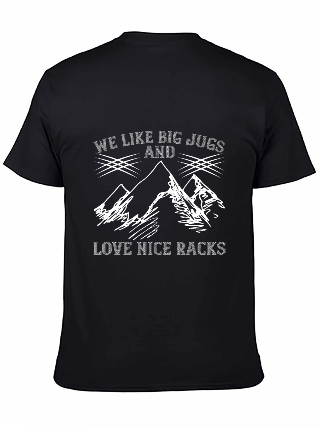 Embrace the outdoors with this humorous black T-shirt! Featuring a mountain graphic with the playful text "WE LIKE BIG JUGS AND LOVE NICE RACKS", this tee is perfect for hikers and outdoor enthusiasts with a sense of humor. The design is printed in a contrasting color, ensuring it stands out. This comfortable shirt is ideal for casual wear, hiking adventures, or as a conversation starter. Show off your love for the mountains with this unique and attention-grabbing tee! It is also a great gift for the hiker in your life.