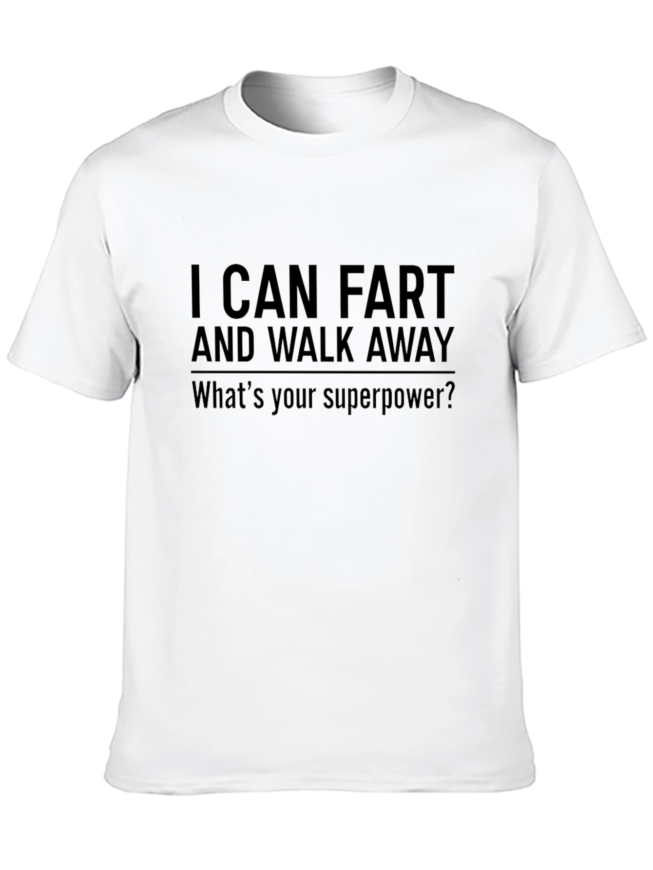 This black t-shirt features the humorous text "I CAN FART AND WALK AWAY. What's your superpower?" It's a fun and lighthearted garment perfect for casual wear. The shirt appears to be made from a soft, comfortable material, making it ideal for everyday use. Its classic fit ensures a relaxed and easy-going style. Wear it to parties, social gatherings, or simply when you want to add a touch of humor to your outfit. This t-shirt is a great conversation starter and is sure to get a few laughs. The dark color makes it versatile and easy to pair with jeans, shorts, or casual pants.