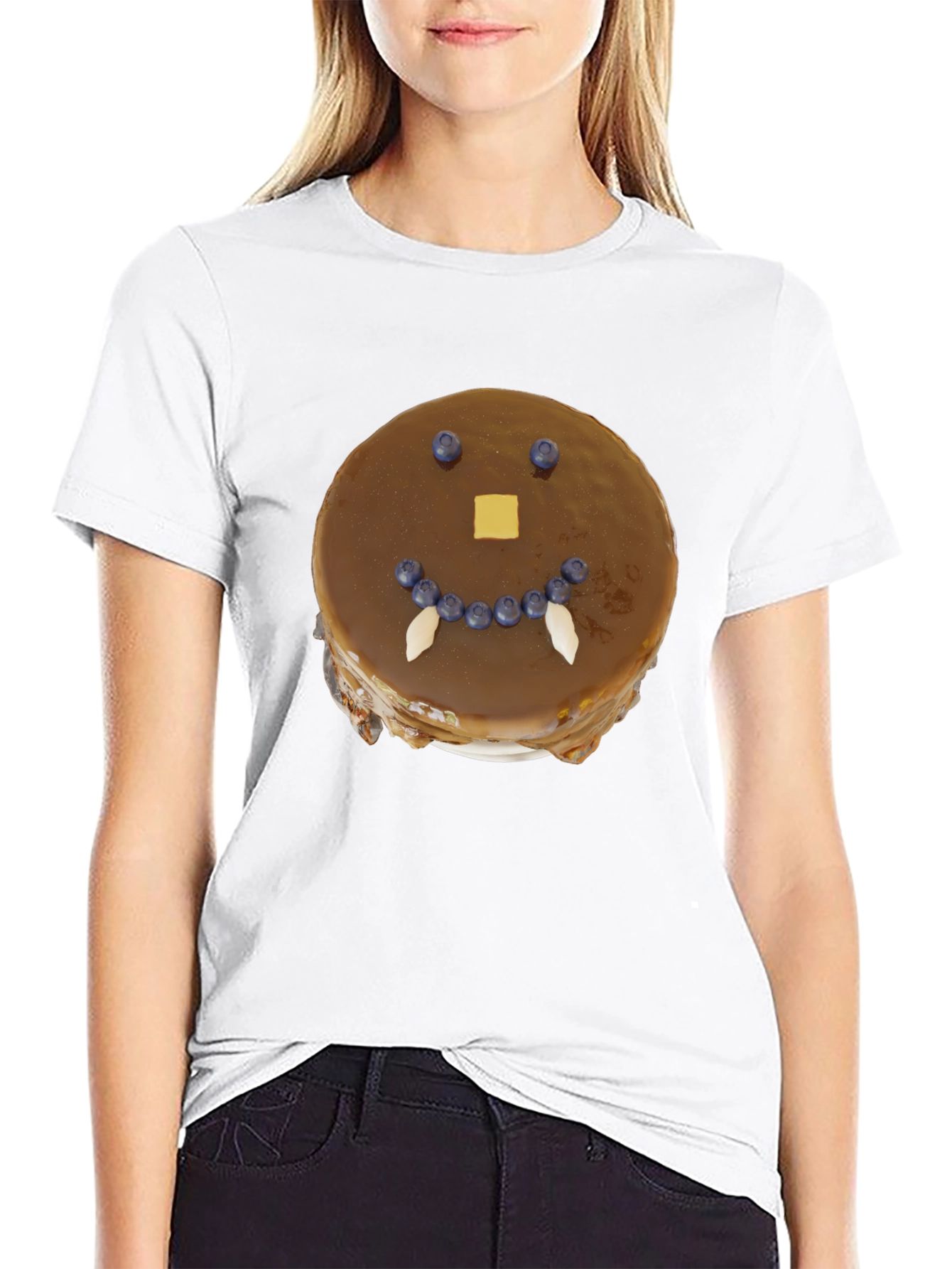 Show off your love for breakfast with this unique and playful black t-shirt. Featuring a vibrant graphic of a pancake with a fun, expressive face made of blueberries, butter, and almonds, this tee is sure to turn heads and spark conversations. The high-quality print ensures the design stays crisp and colorful, even after multiple washes. Crafted from a soft, breathable fabric, this t-shirt offers all-day comfort, whether you're lounging at home or out with friends. Perfect for casual wear, breakfast enthusiasts, or anyone with a sense of humor. Add a touch of whimsy to your wardrobe with this pancake face tee!