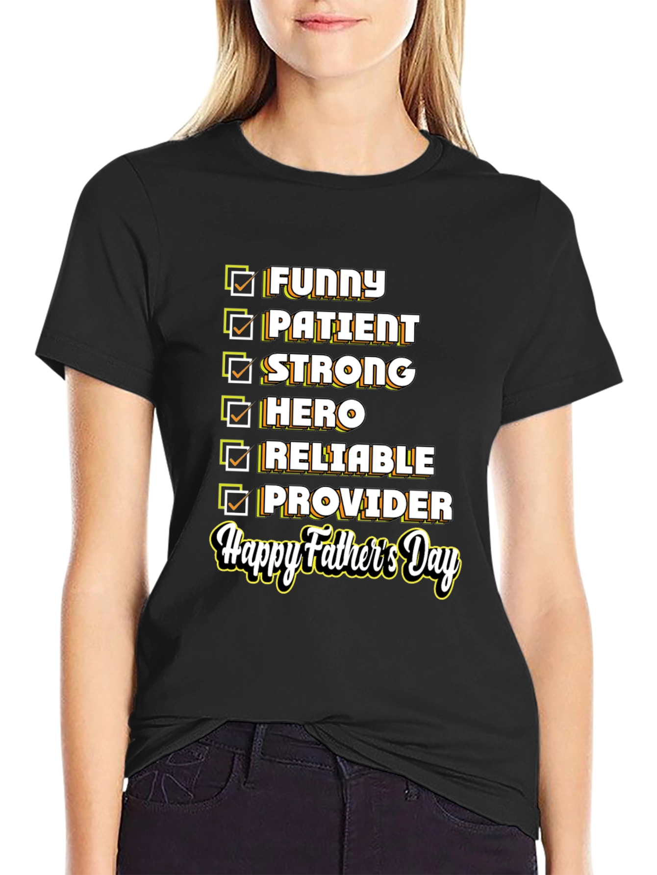 Celebrate Father's Day with this stylish black t-shirt! This tee features a checklist design with "Funny, Patient, Strong, Hero, Reliable, Provider" printed in bold, eye-catching lettering. Perfect for showing appreciation to a great dad, this shirt combines comfort and a fun design. The classic fit makes it suitable for everyday wear, casual outings, or family gatherings. Give the gift of style and sentiment with this unique Father's Day apparel.