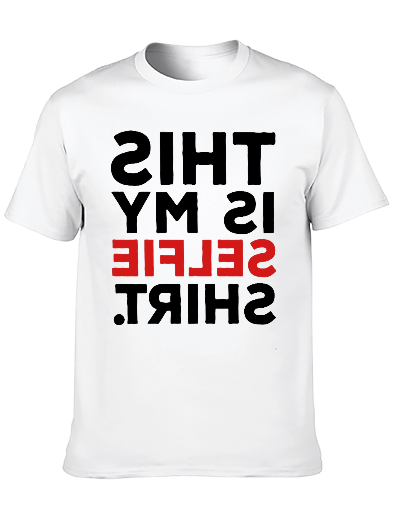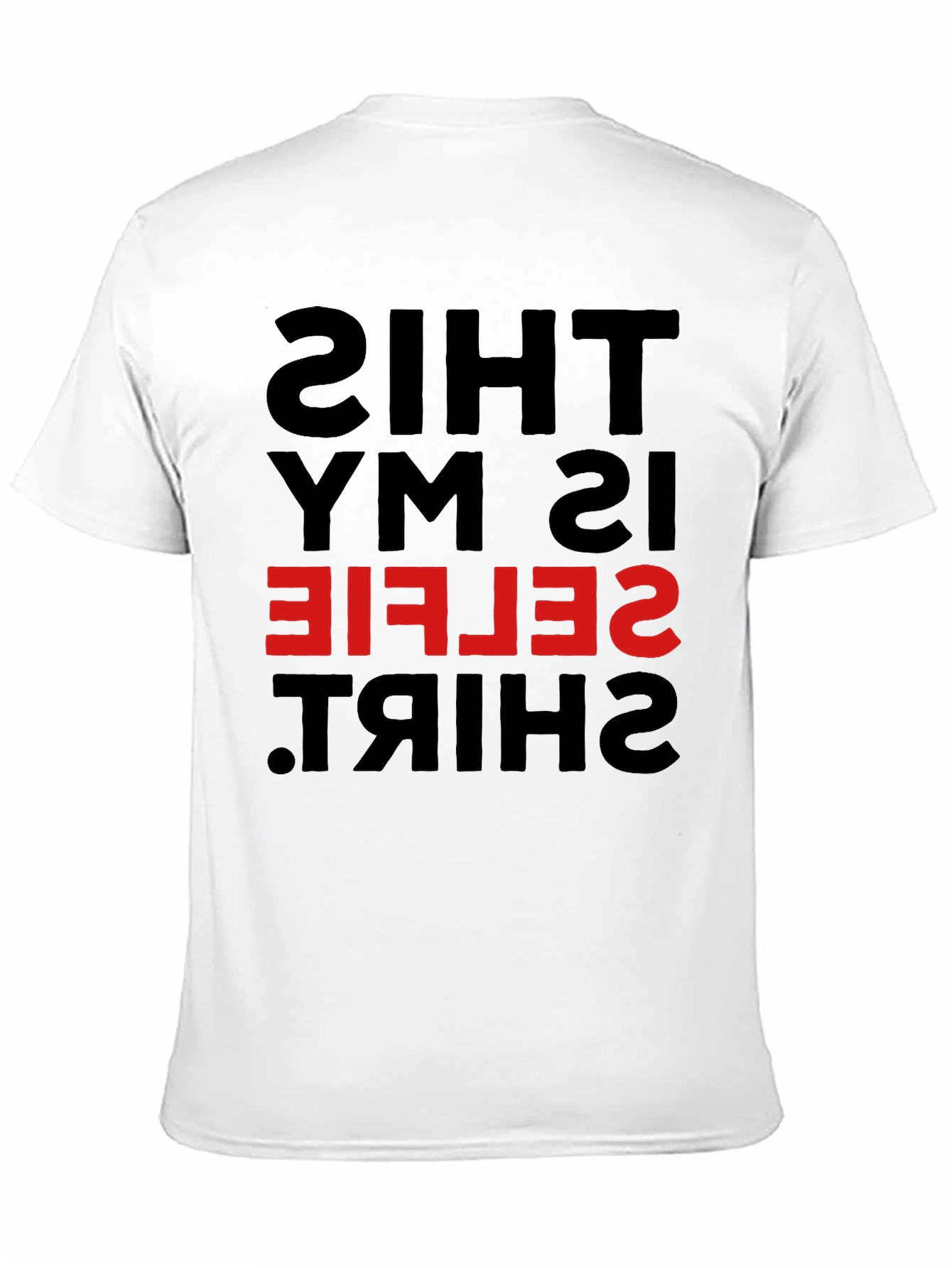 This unique black tee features an eye-catching inverted text design that reads 'This Is My Selfie Shirt' when viewed in a mirror. The word 'Selfie' is highlighted in red, adding a pop of color to the design. Made from a comfortable material, this t-shirt is perfect for casual wear and makes a great conversation starter. The bold graphic adds a touch of humor, making it ideal for social gatherings, parties, or just expressing your fun-loving personality. Grab this tee and always be selfie-ready!