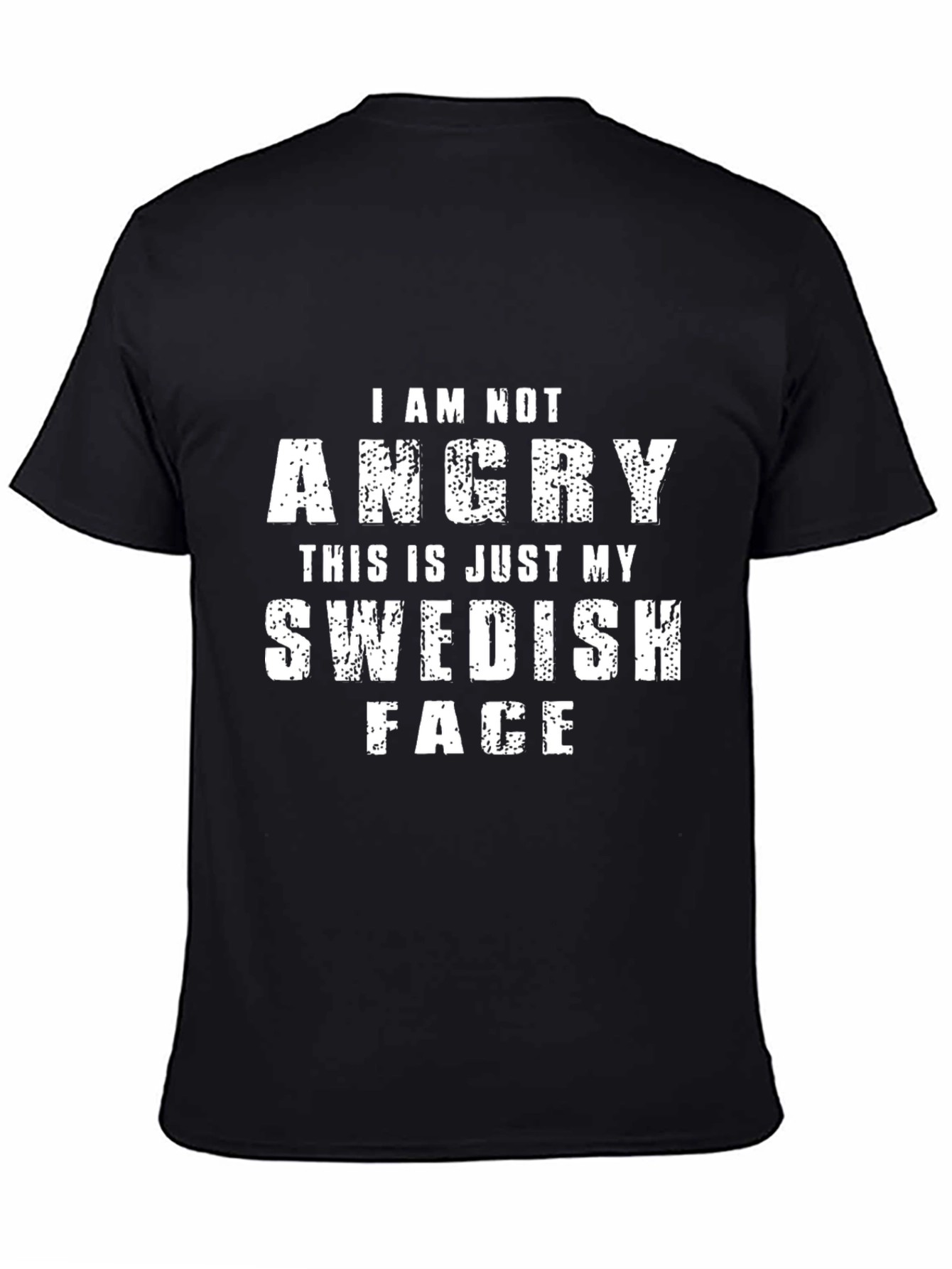 Show off your humor with this unique black t-shirt! The design features the phrase 'I AM NOT ANGRY THIS IS JUST MY SWEDISH FACE' in a bold, distressed white font. Made from a comfortable-looking cotton blend, this tee is perfect for casual wear. Get ready to turn heads and spark conversations. This eye-catching shirt is a fun addition to your wardrobe or a great gift for that special someone with a Swedish sense of humor! Style and comfort meet in this must-have tee.