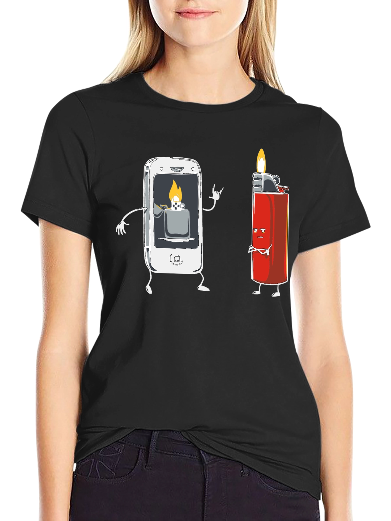 This unique black t-shirt features a humorous graphic design. It shows a cartoon smartphone character 'holding' a Zippo lighter, mimicking the functionality of a lighter app. Beside it, another red lighter character seems unimpressed, creating a funny comparison between old and new technology. The shirt is perfect for those who appreciate quirky humor and tech-related jokes. Made from comfortable materials, this t-shirt offers a relaxed fit, making it ideal for everyday wear, casual outings, or as a conversation starter among tech enthusiasts. Express your fun personality with this eye-catching tee!