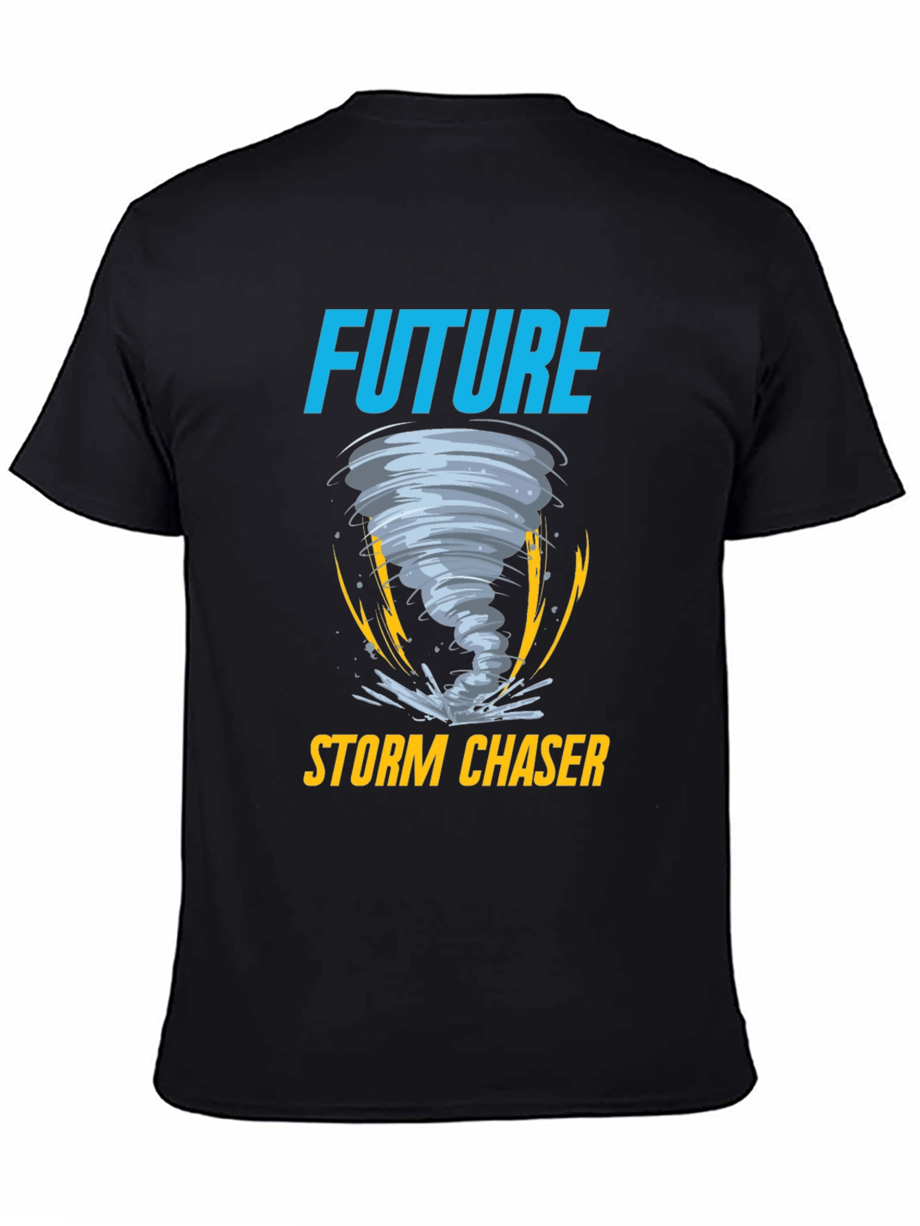 Embrace your passion for extreme weather with this eye-catching black t-shirt. The shirt features a bold graphic design of a swirling tornado, accented with vibrant yellow lightning bolts, positioned between the words 'FUTURE' in a bright blue and 'STORM CHASER' in a matching yellow. Made from comfortable material, this tee is perfect for casual wear or as a statement piece for weather enthusiasts. Showcase your love for storm chasing with this unique and stylish design that is sure to spark conversations.