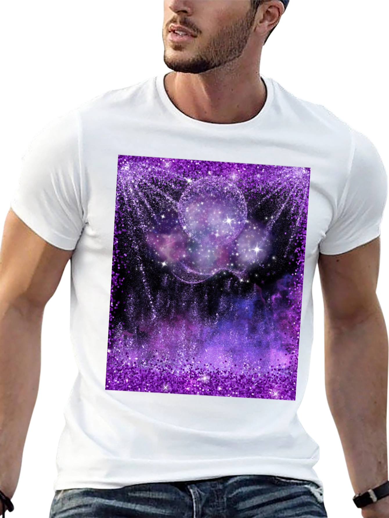 Elevate your style with this striking black t-shirt featuring a vibrant galaxy glitter print. The design showcases celestial bodies and shimmering accents, creating a visually stunning effect. Made from comfortable fabric, this tee offers a relaxed fit for all-day wear. Perfect for casual outings, concerts, or adding a touch of cosmic flair to your everyday look. This unique piece is sure to turn heads and spark conversations wherever you go. Embrace the brilliance and make a bold statement with this eye-catching galaxy glitter tee.
